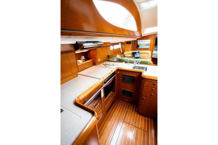 Galley located on port side on slightly lower level, one step down Synthetic resin countertop with : top icebox cover, folding stove cover, dish drain, double sink with covers, drawers 140 liter refrigerator, seawater cooled Front-loading refrigerator door, shelves, storage bin 140 liter icebox, top loading, with storage bins Fresh and seawater foot pump Upper shelf furnishings for microwave, dishes, and storage Oven ventilator fan, 4 burner stove/oven with crash bar Three cutlery drawers, trash basket on sliding rail Storage locker on aft bulkhead Access to thru-hulls behind salon seat backrest Glass divider between galley and salon Mixer tap with flexible hose Handrail and compression post for mainsail traveler track