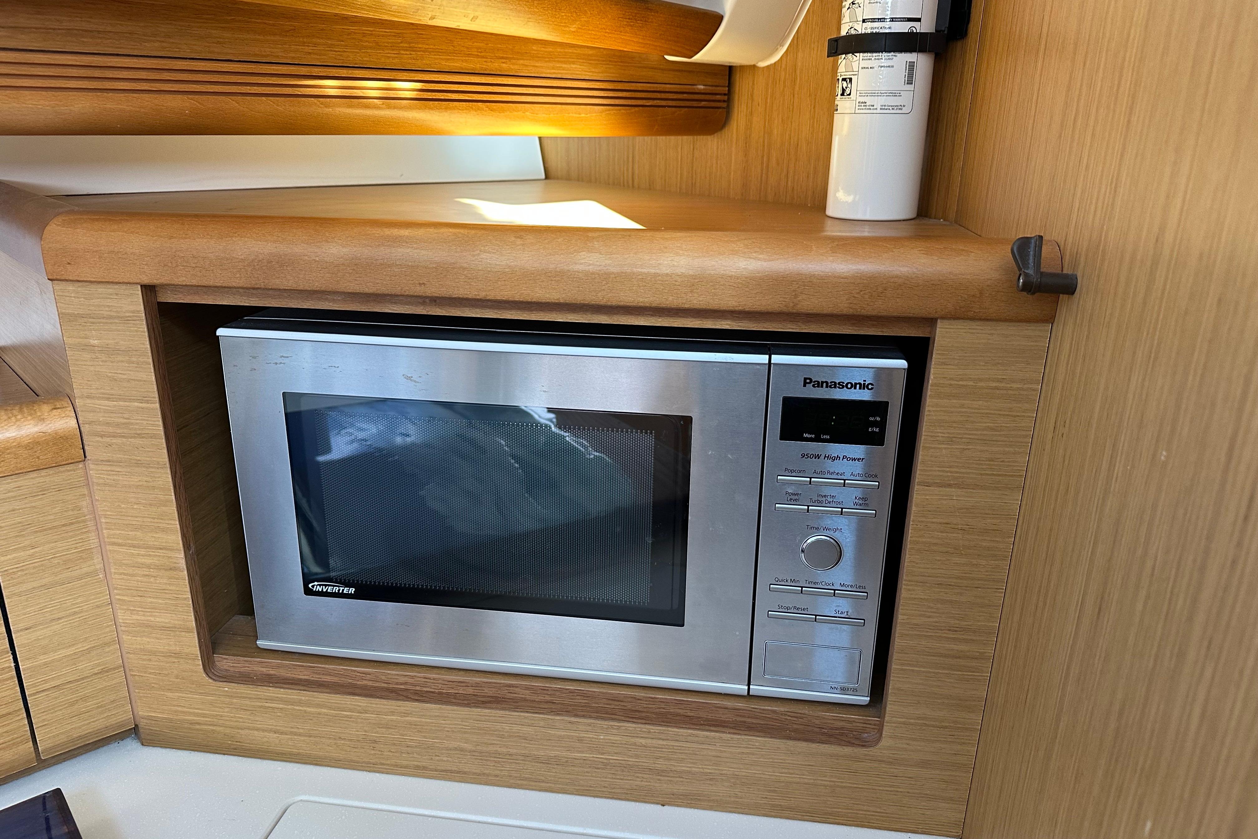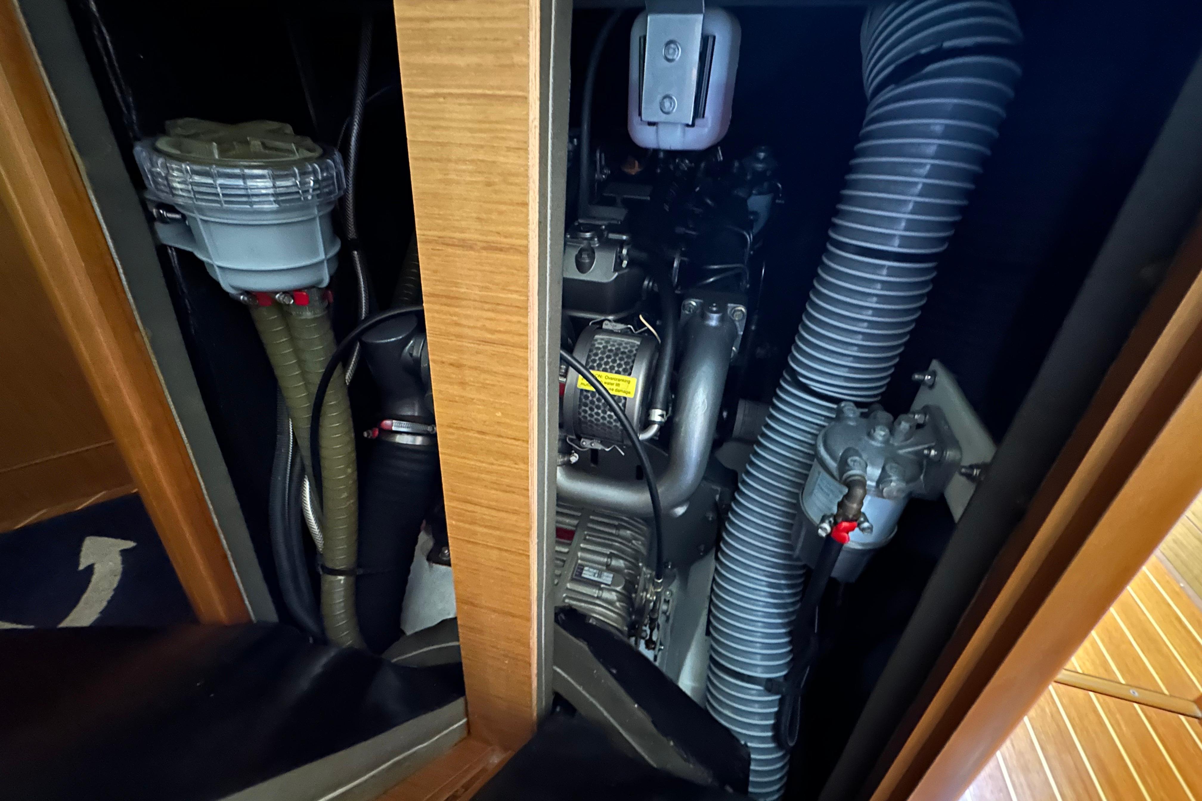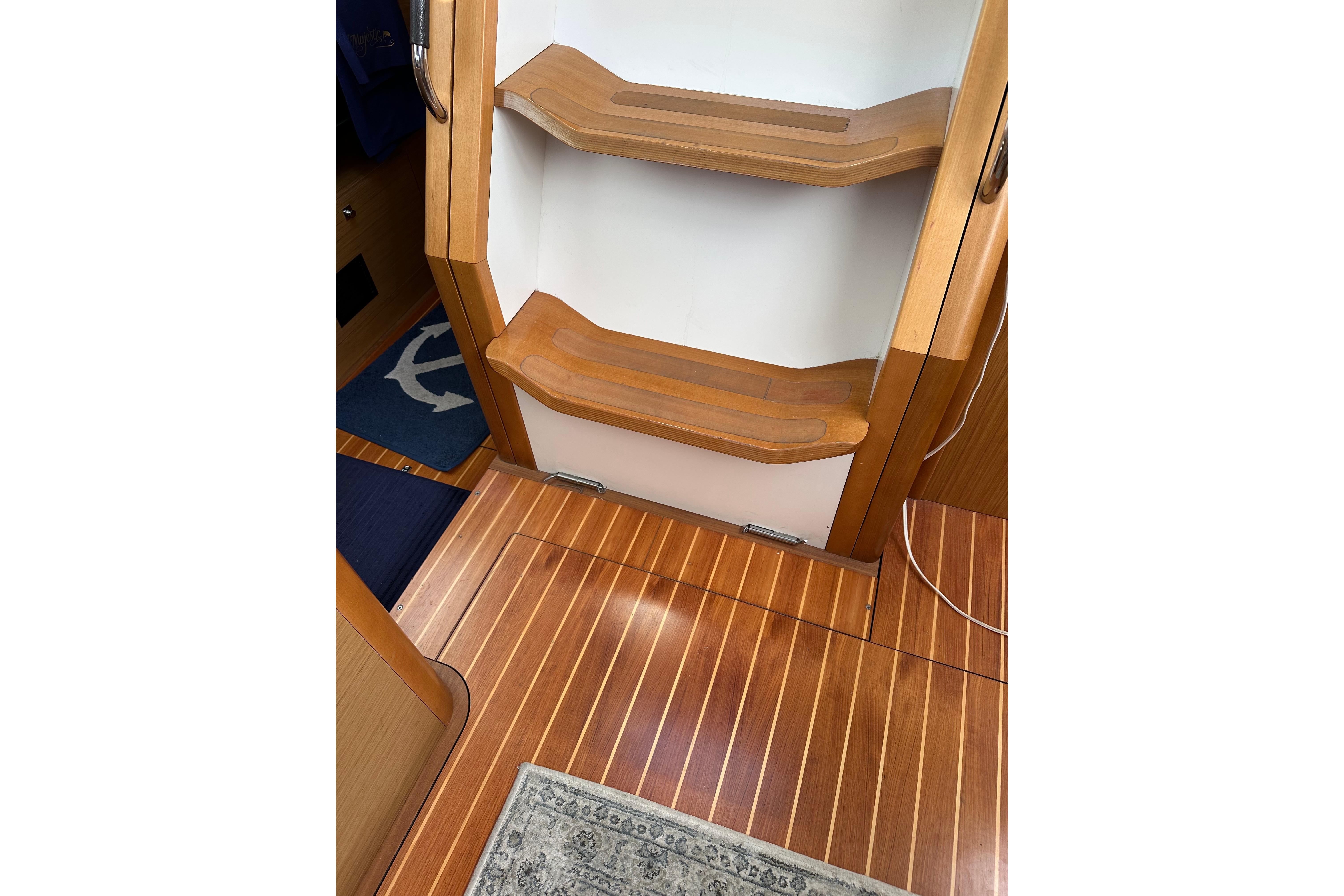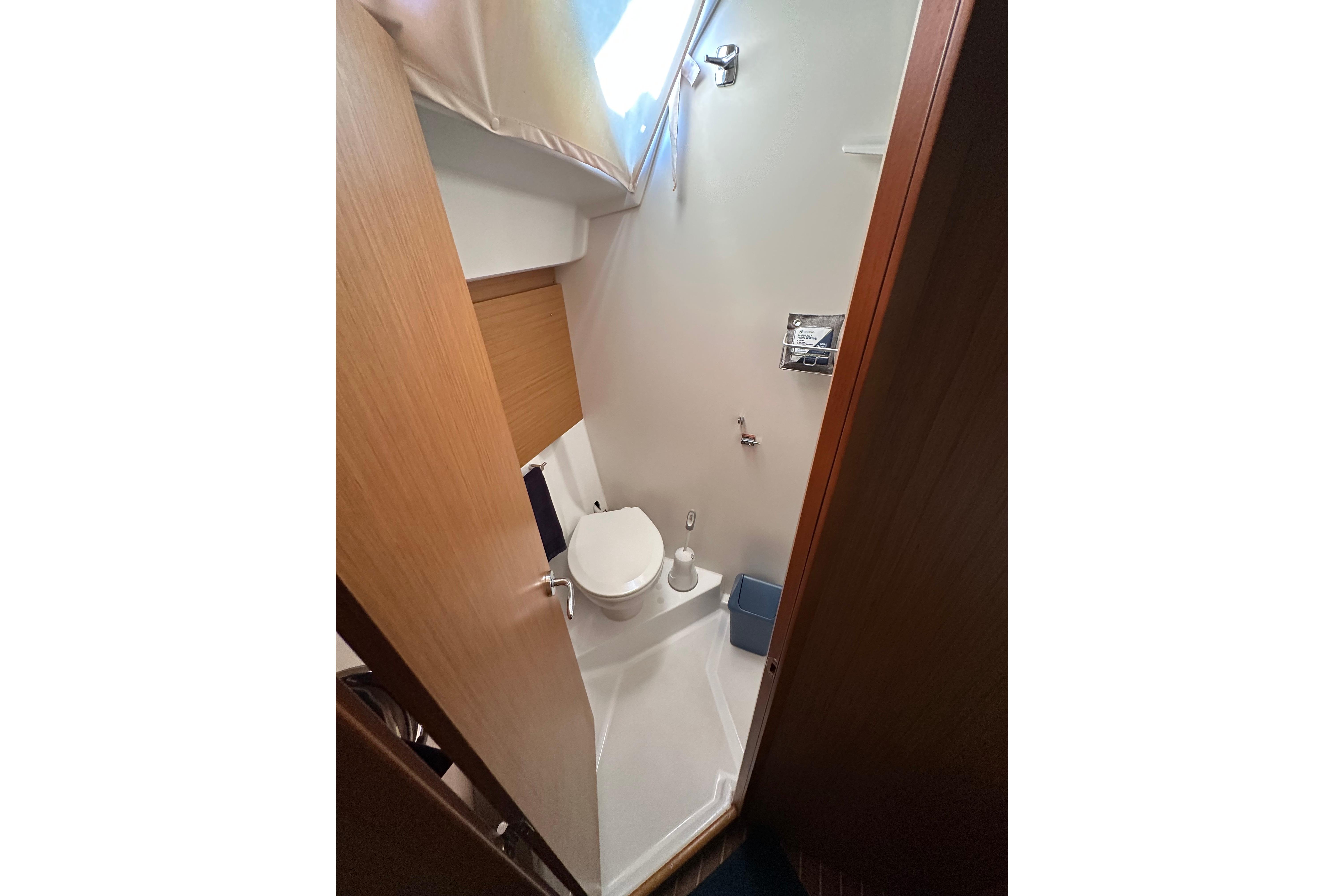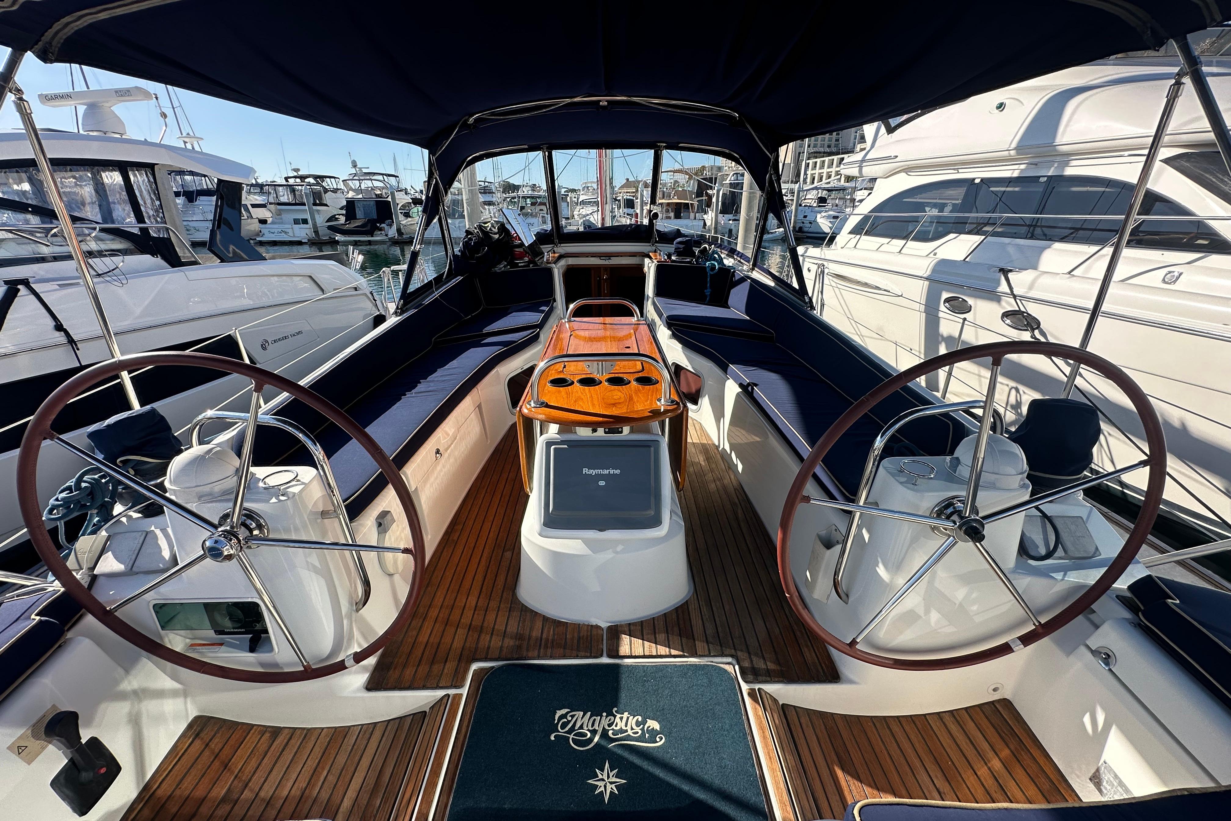 The spacious cockpit is ideal for entertaining or passage making, offering comfort, visibility, and easy access to all sail controls. Below deck, the 45 DS truly shines. The raised deckhouse and iconic teardrop windows—styled by Garroni Design—flood the interior with natural light, creating an open, airy salon rarely found in yachts of this size. Curved lines, wrap-around windows, and oversized hull ports enhance both visibility and ambiance and central AC privides both cool air, and heat in ALL cabins and salon throught out the vessel for a comfortable stay onboard.