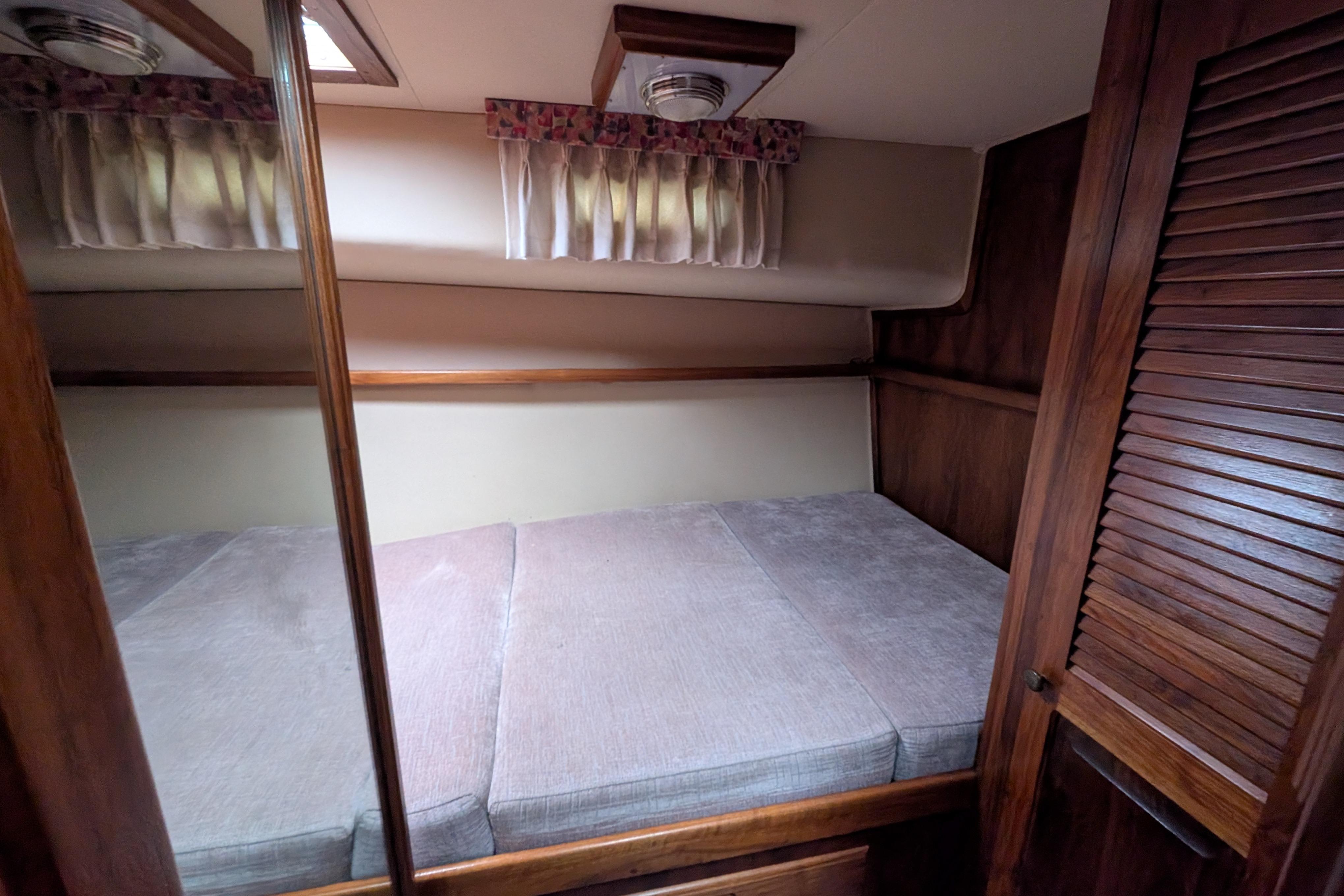 - Forward master cabin with double berth to starboard, small bench seat, and Hanging locker to port