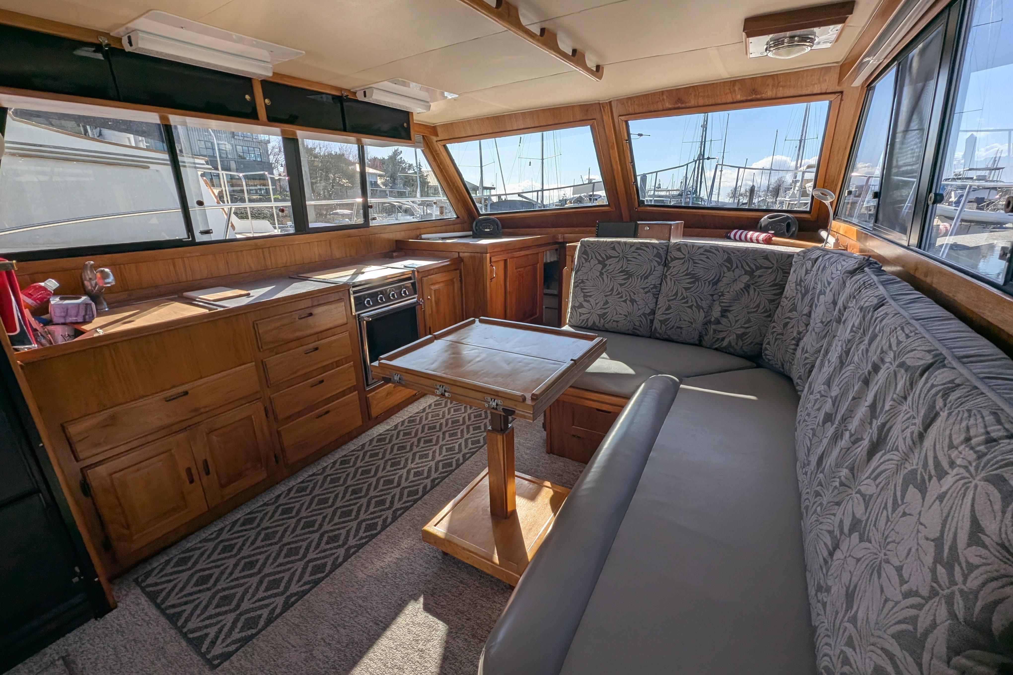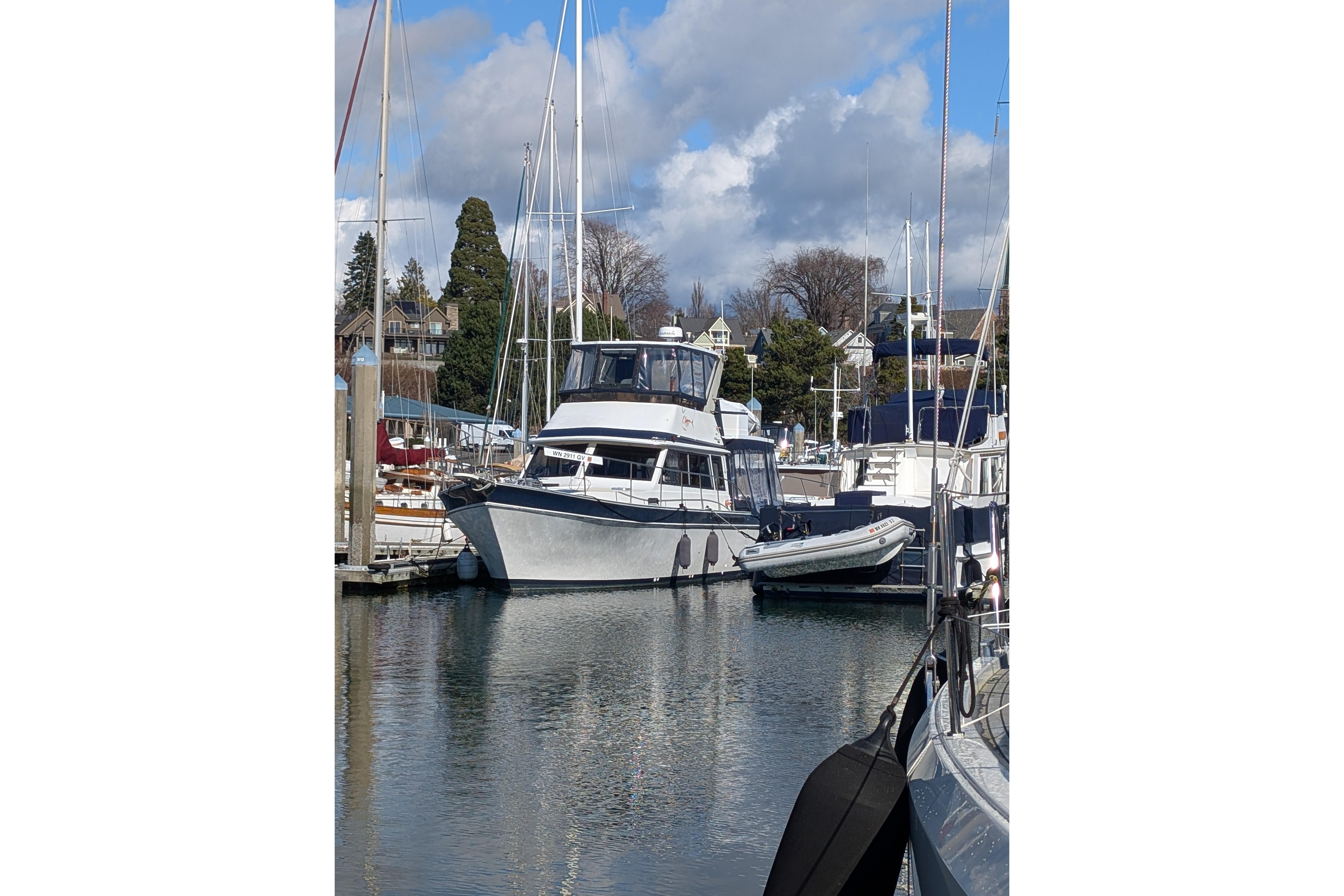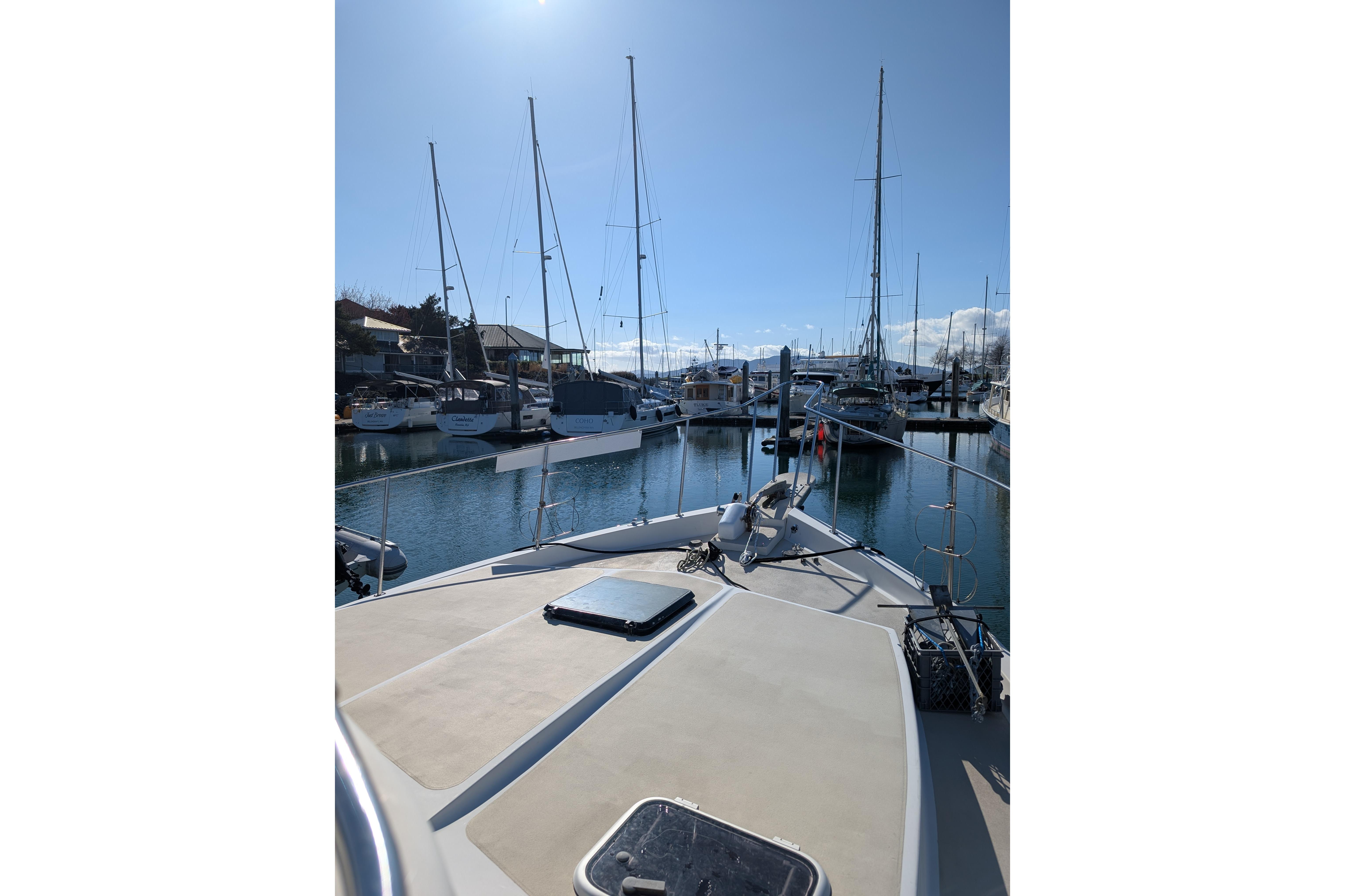 This particular vessel is great for the Pacific Northwest because it has been fitted with a fully enclosed cockpit and flybridge with aluminum hardtops.
