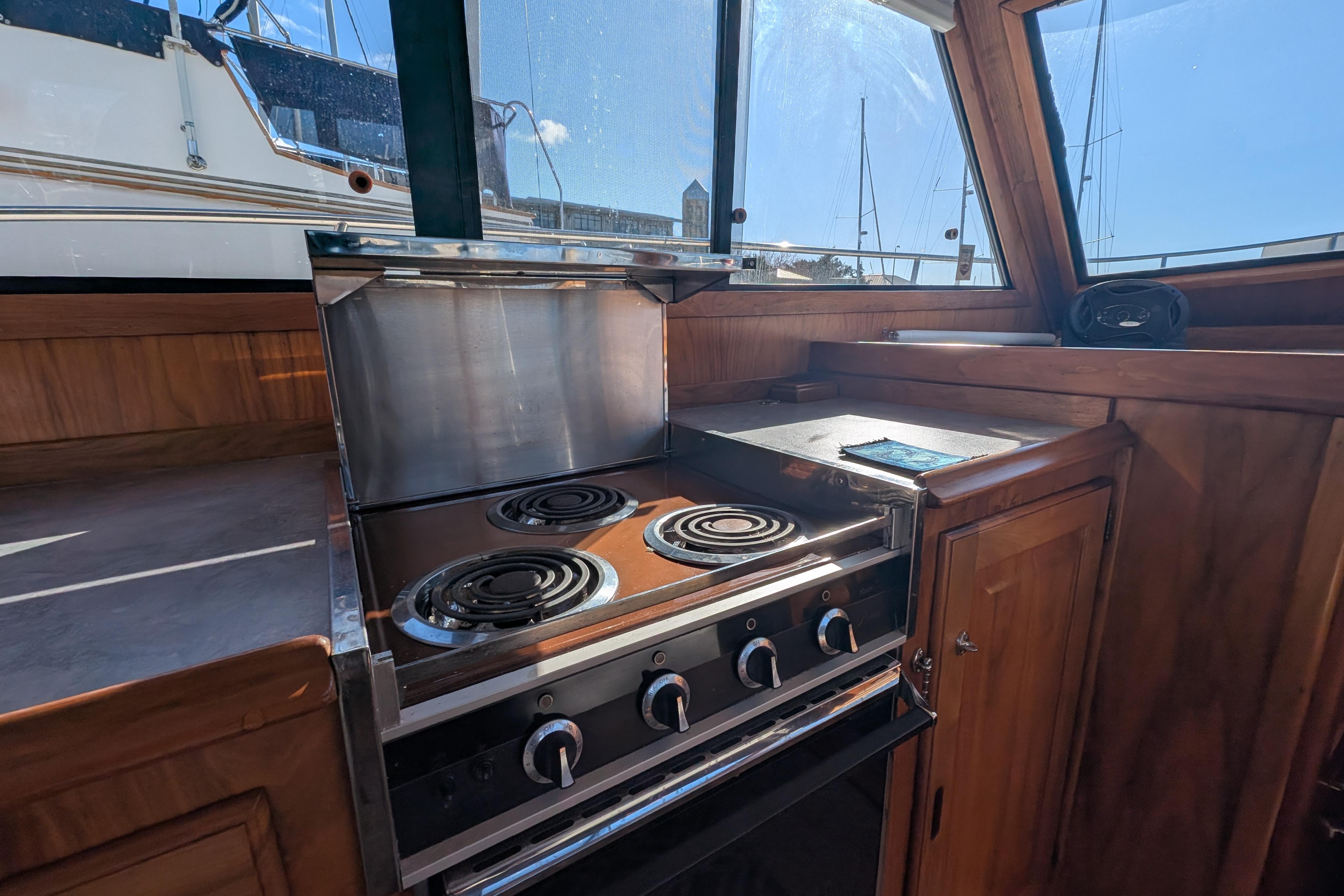 The Californian 38 Convertible was designed for family fishing or weekend cruising. Built on a solid fiberglass modified-V hull with a shallow keel—the same hull used in the production of the popular Californian 38 Motor Yacht. Her standard two-stateroom interior was arranged with a big L-shaped galley in the salon opposite a built-in settee. Both staterooms are fitted with double berths, and there’s a large stall shower in the single head compartment. On deck, the cockpit is large enough for the occasional fishing venture. Like all Californian models, the side walk-around decks of the 38 Convertible are notably wide with molded steps into the cockpit for easy access. Additional features include a bow pulpit, wraparound cabin windows, and a well-arranged flybridge with roomy bench seating behind the helm. Caterpillar 3208T 300 hp diesels cruise at 11 knots and deliver a top speed of 15 knots.