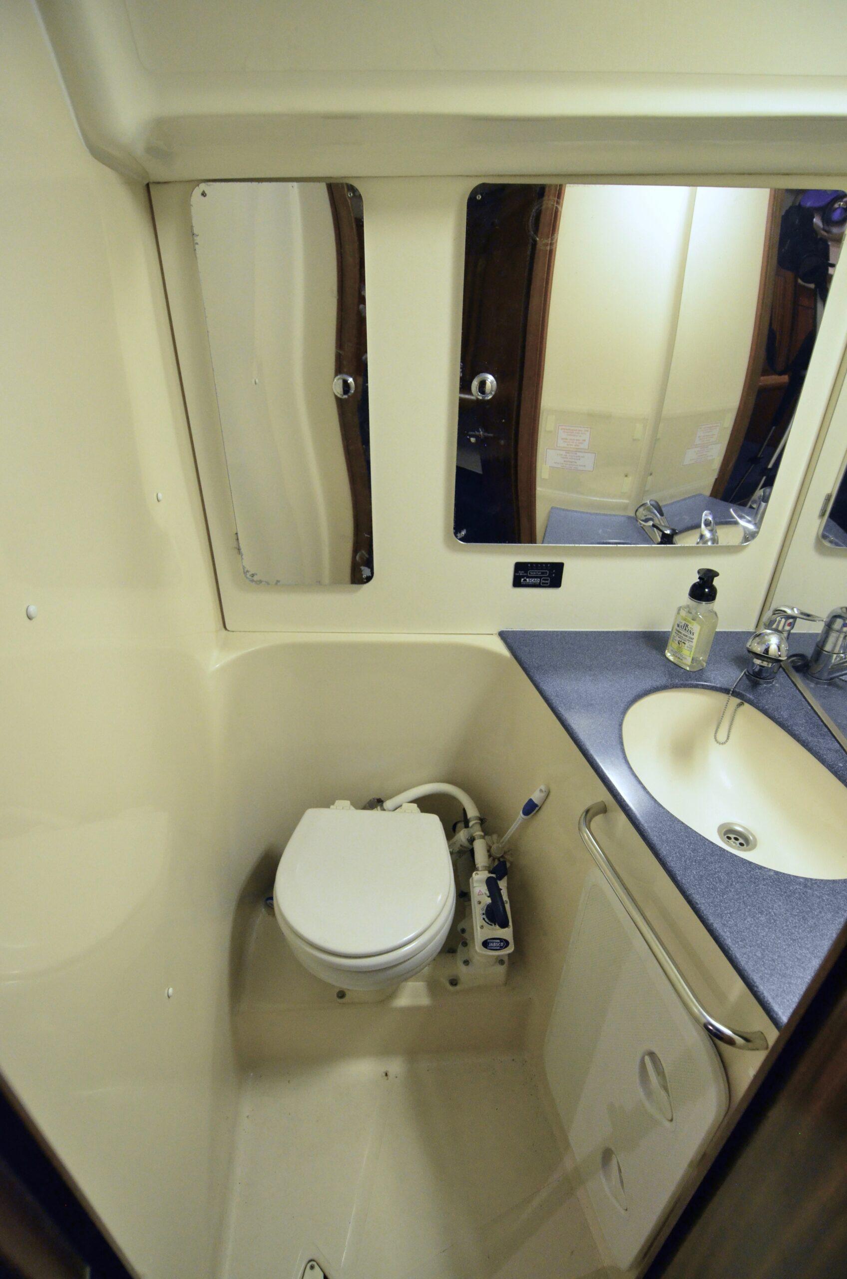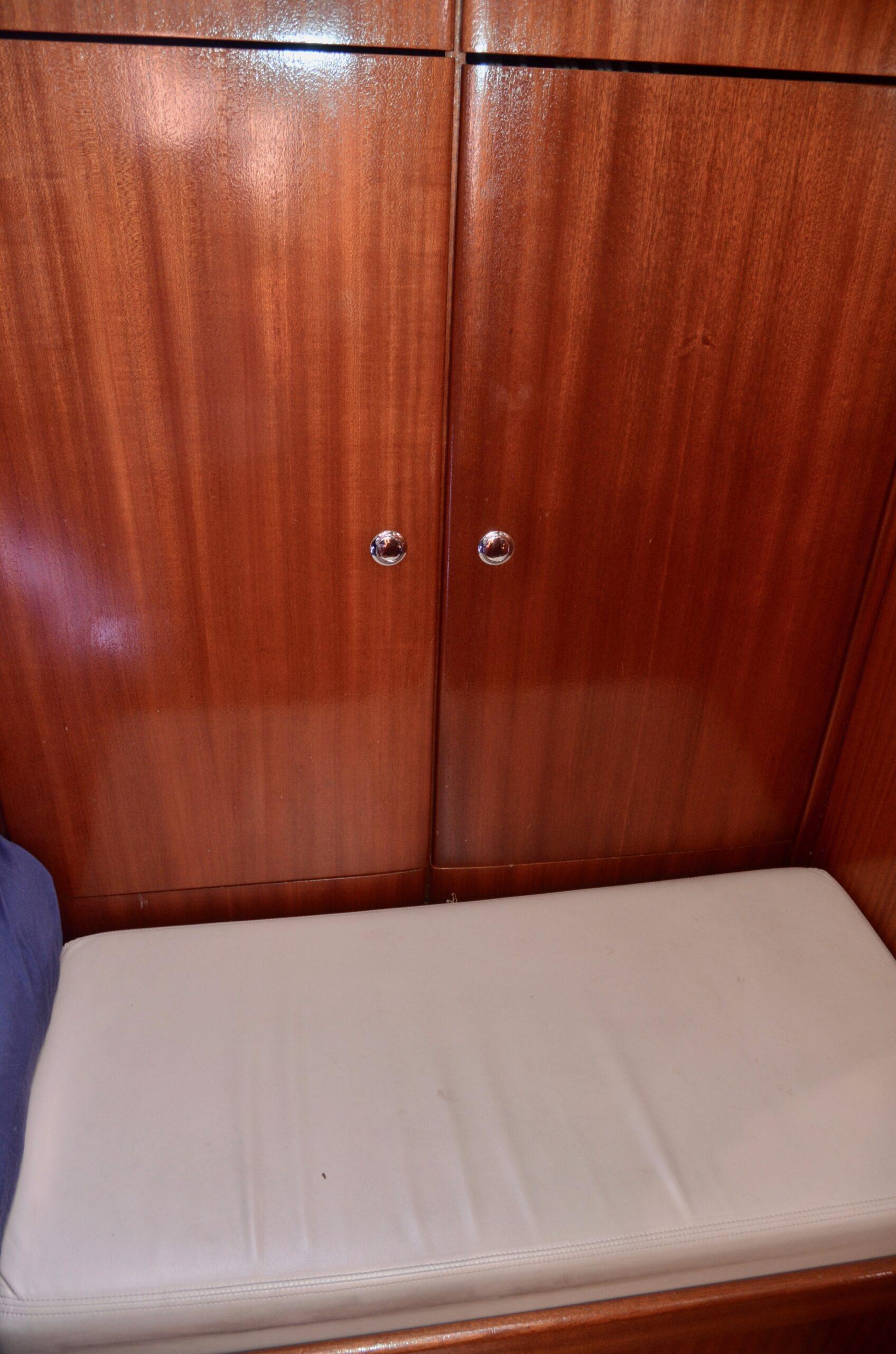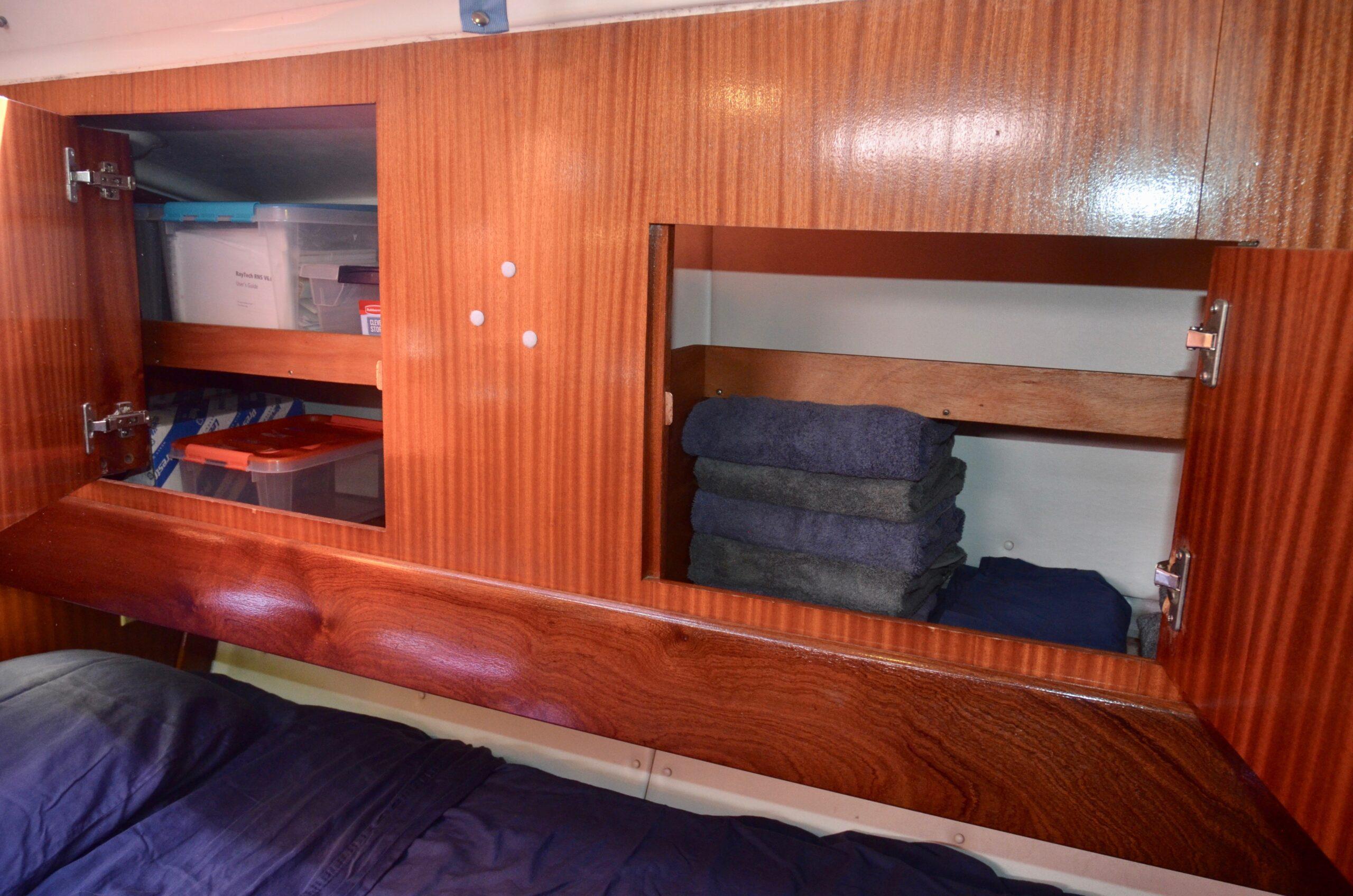 The large aft cabins have double bunks with generous storage closets. The seating in front of the closets makes getting dressed more pleasant. They have excellent cross ventilation from an overhead hatch and porthole that are protected by the dodger and can be open during rainy weather; a feature you’re sure to appreciate in the Caribbean or Northwest. There are two aft heads with electric flush toilets.