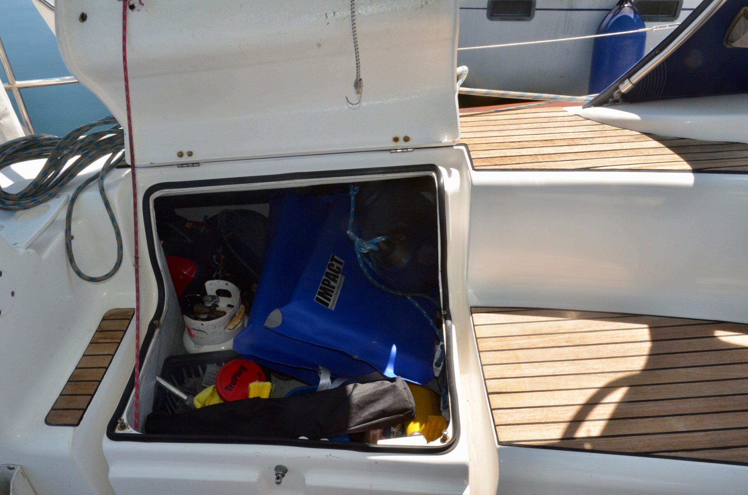 The nav station features a full-sized chart desk with storage beneath as well as easy access to the AC/DC distribution panel, battery monitor and VHF radio.