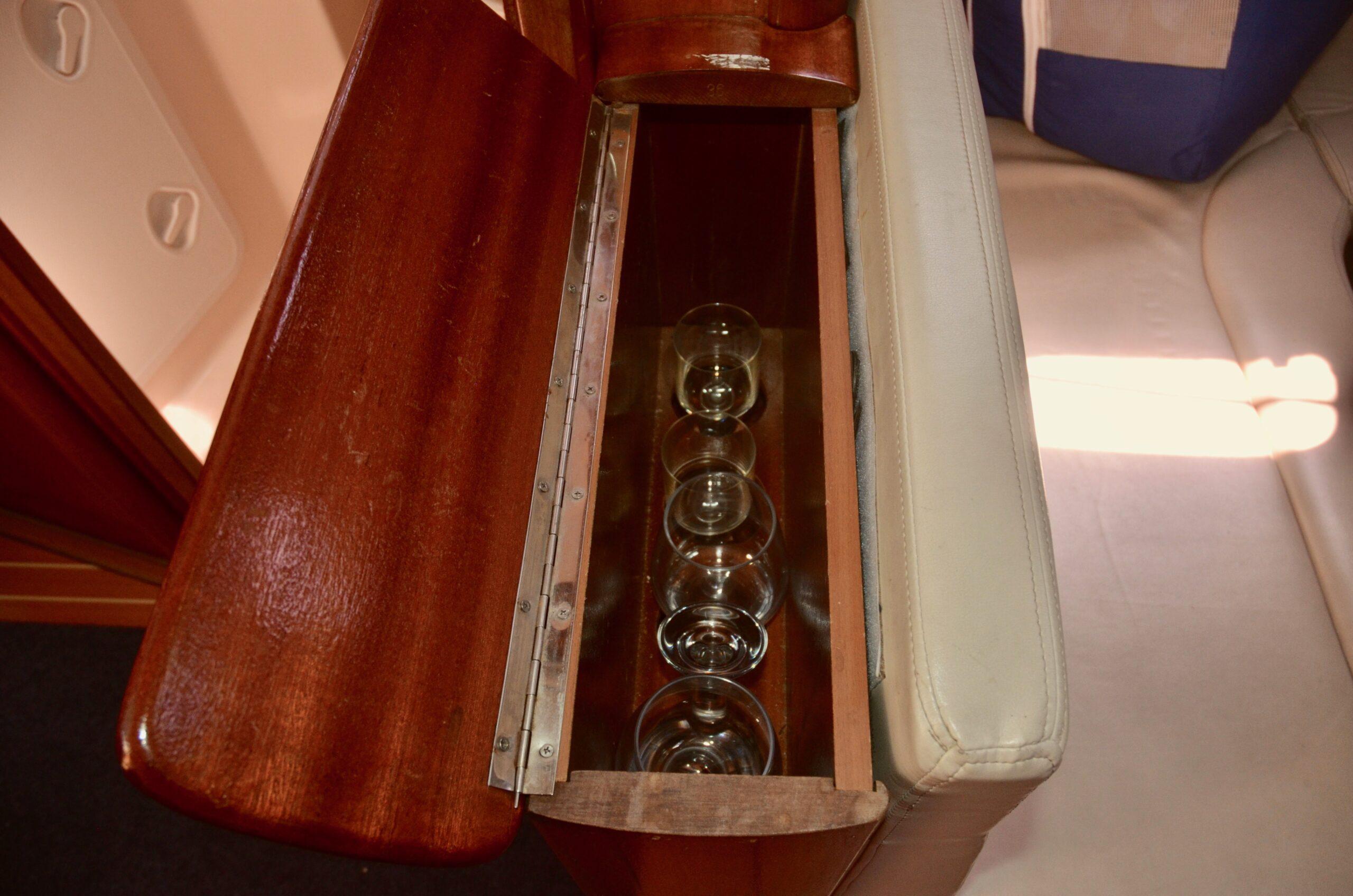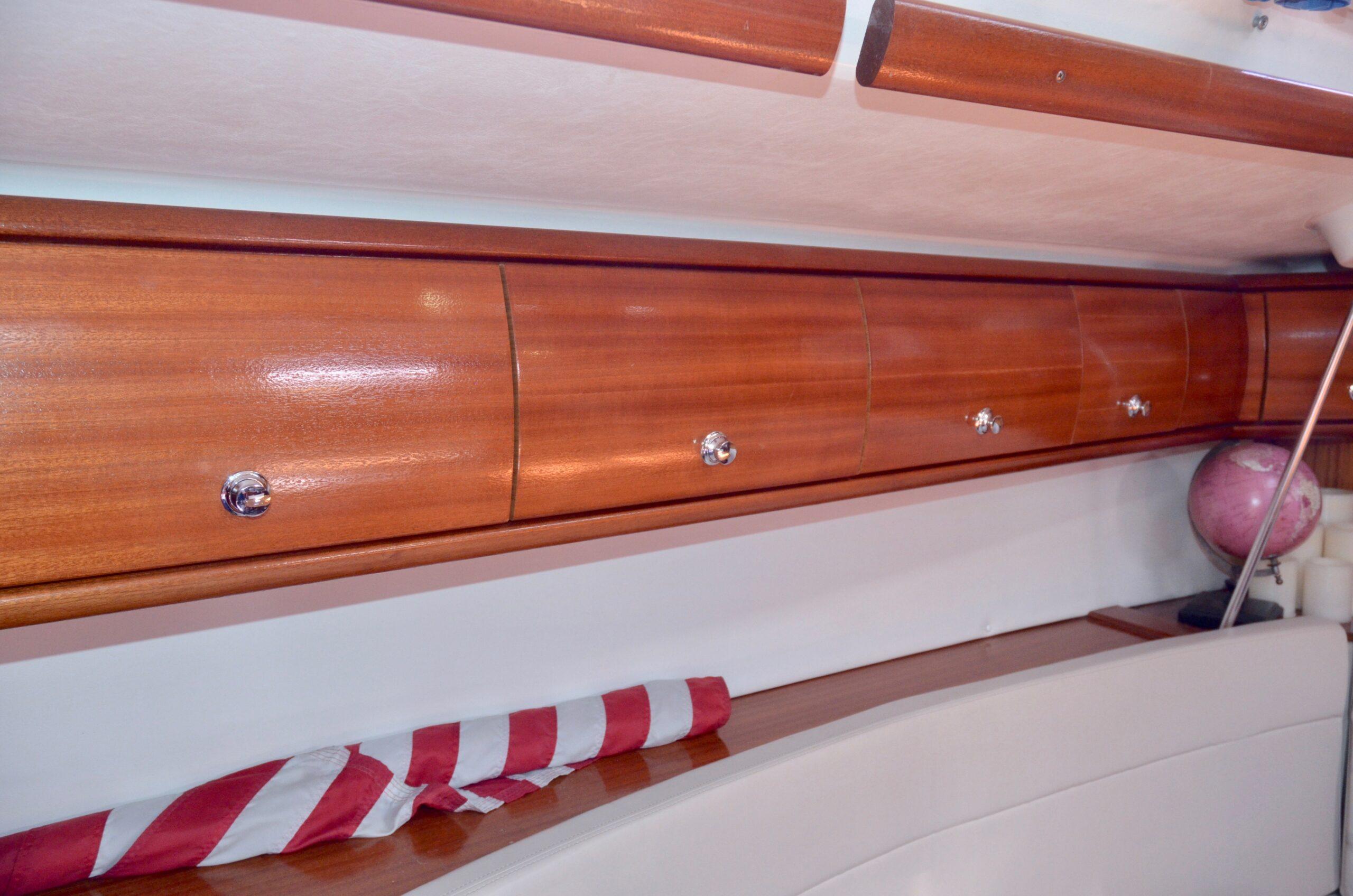 Footloose features a stunning Mahogany interior that is rarely found on newer boats. The large opening ports and hatches provide natural light that keeps the interior warm and inviting but not dark. You’ll find three hidden, top-opening storage areas around the salon for glasses and bottles. The seating cushions are white leather and in excellent condition. There is ample storage in the row of bulkhead cabinets that surround the settee and continue into the galley.