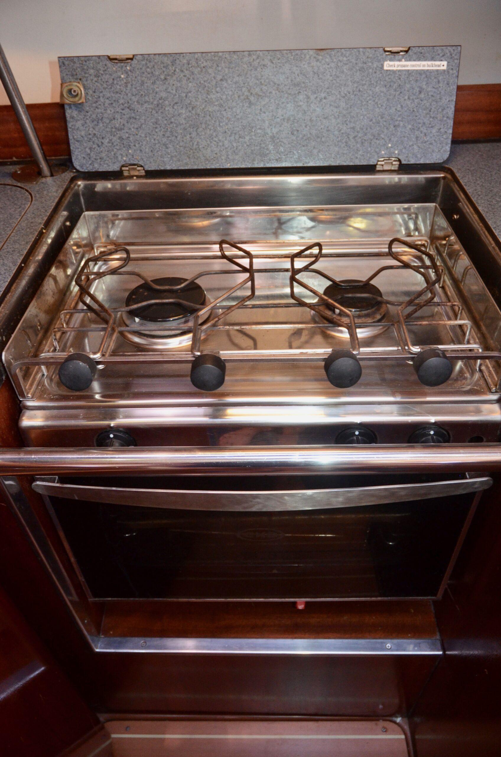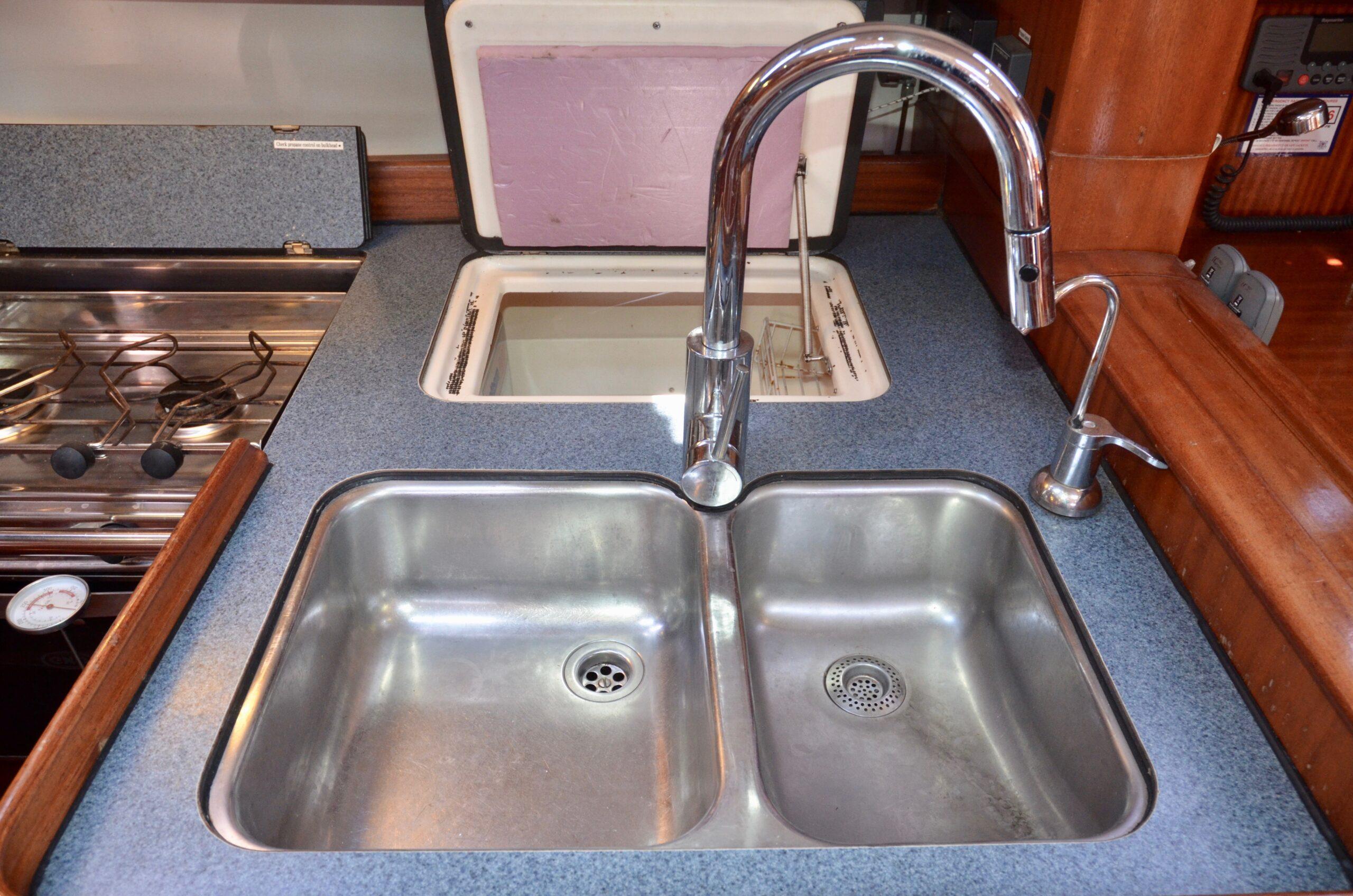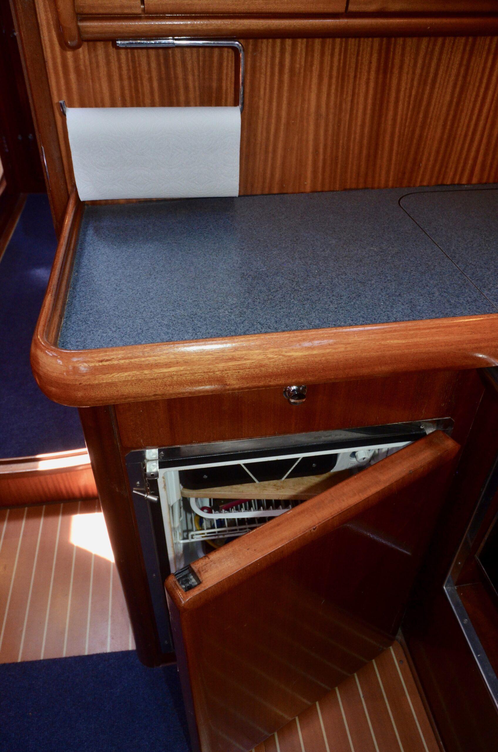 The u-shaped galley has a front opening refrigerator and top loading freezer. The clever design provides a comfortable and safe place to cook at anchor or underway. The galley is well equipped with a two burner propane stove, microwave and ice-maker.