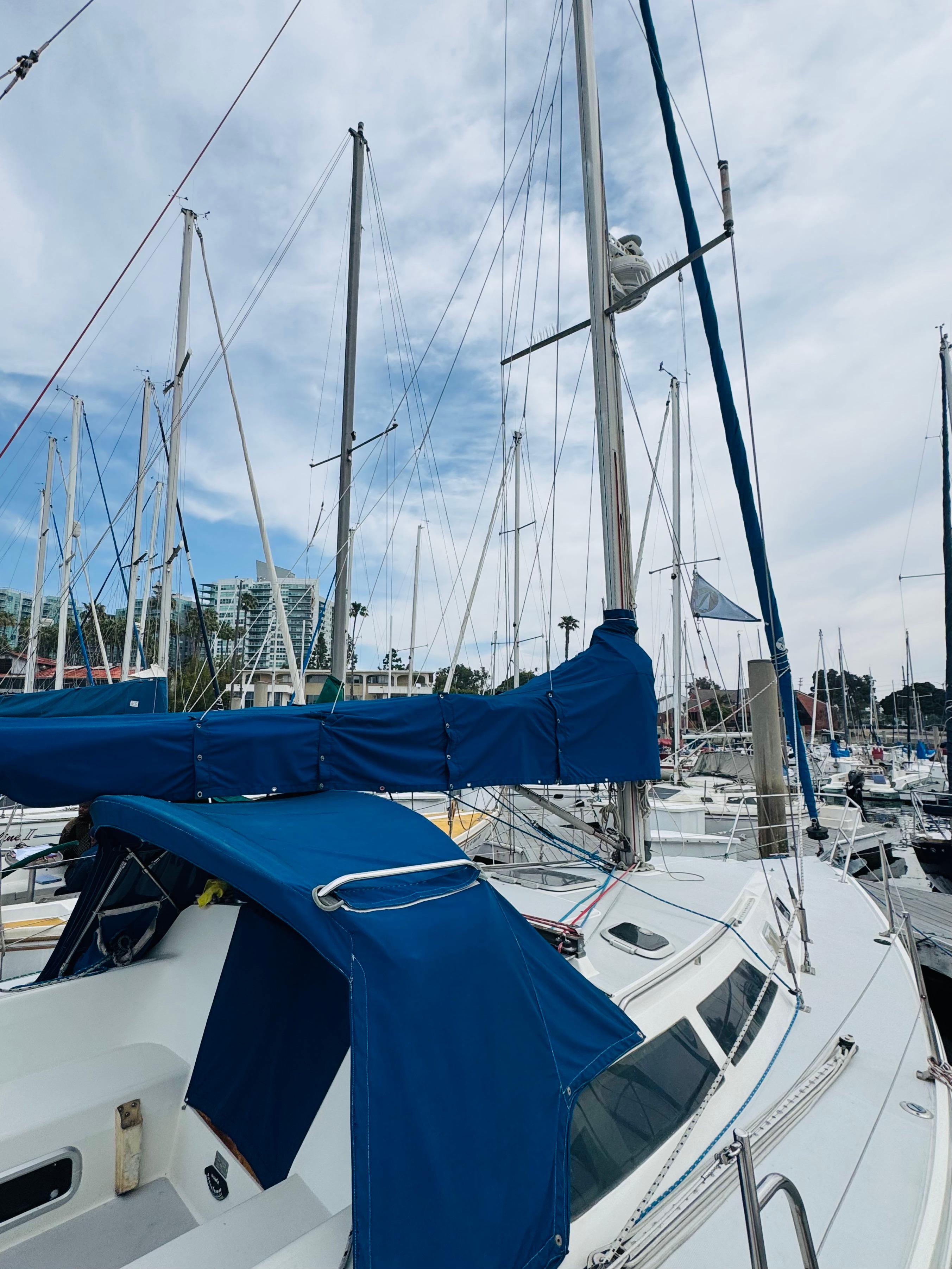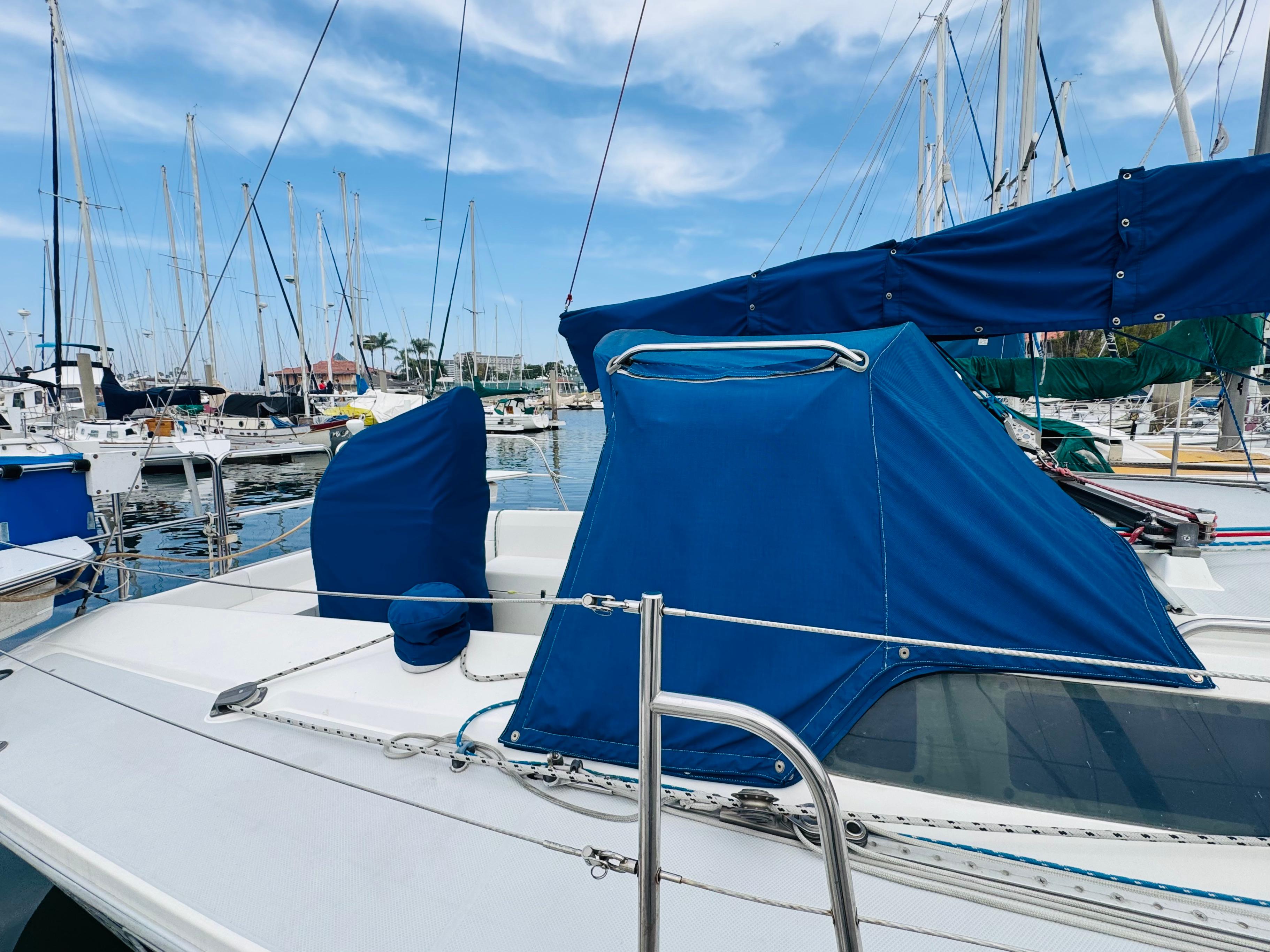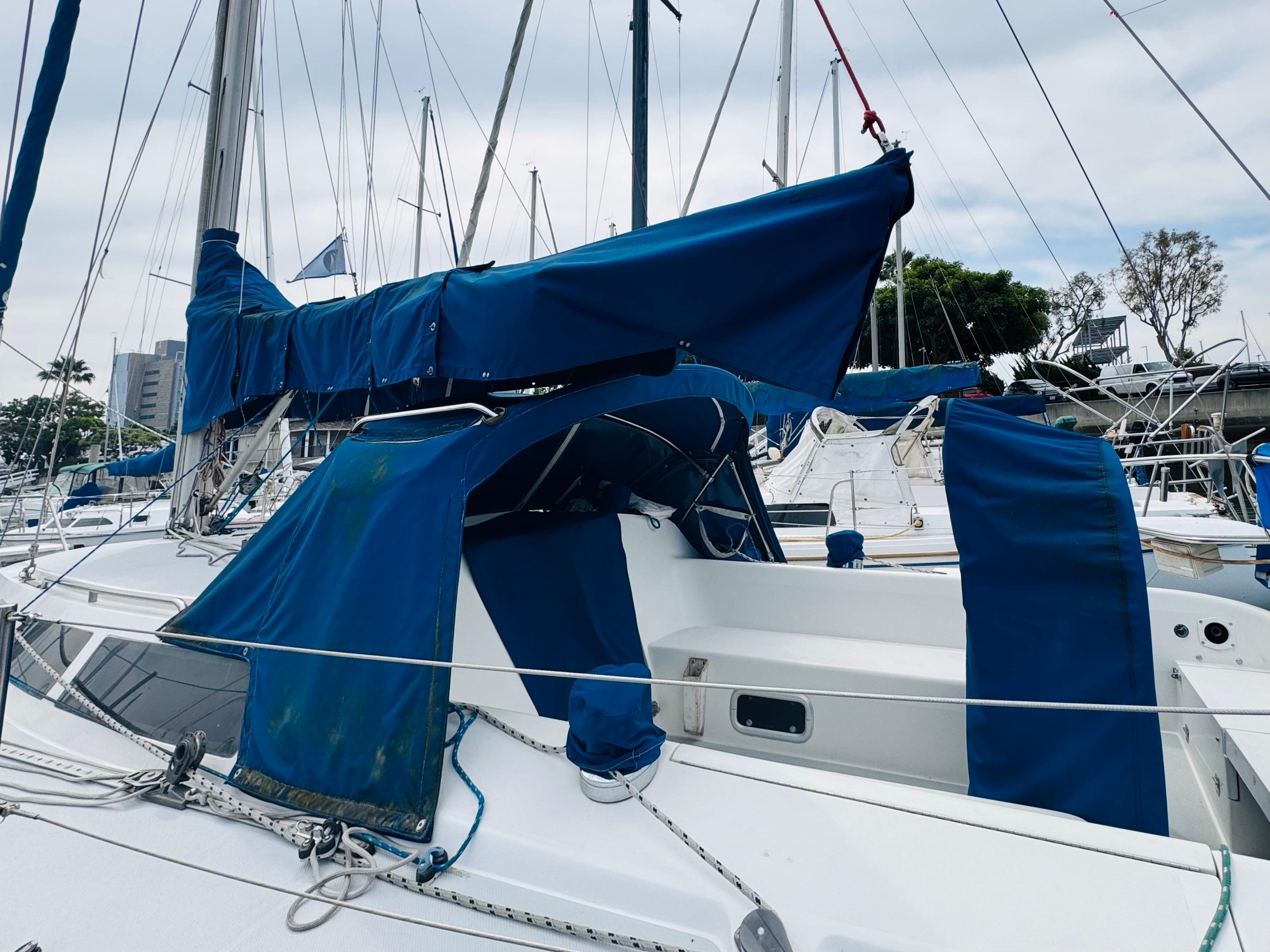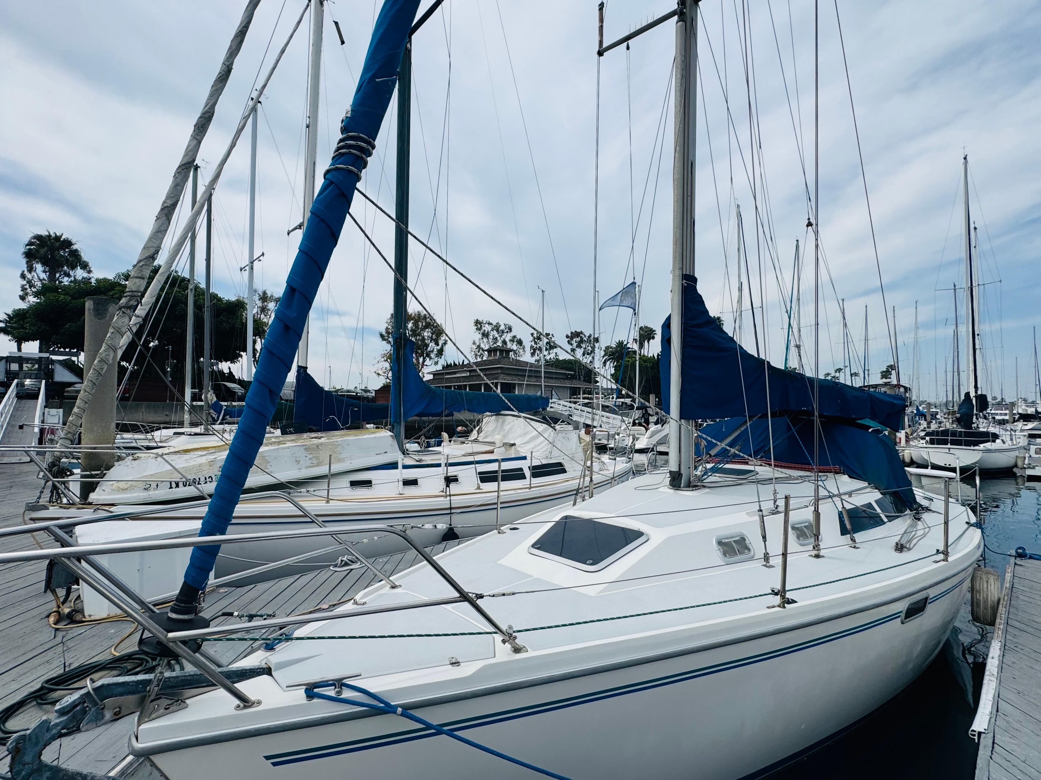 This 1994 Catalina C320 is a contemporary design sleeps 6 and is ideal for a cruising couple or small family for enjoying day sails, overnights or coastal cruising. The large cockpit is protected by a wrap around dodger. It has seating for 8 and comes with custom cushions. Easy access to the water is provided by a walk-through transom with a swim platform. There is plenty of storage available in the 2 cockpit lockers. Down below the features a comfortable under way C shaped galley with plenty of counterspace, gimbaled stove and top loading fridge/freezer. The salon and cabins are finished in light teak and hardwoods. There is 6' standing headroom in the cabin. The boat is powered by a Perkins M30 providing plenty of power to get the boat up to hull speed.