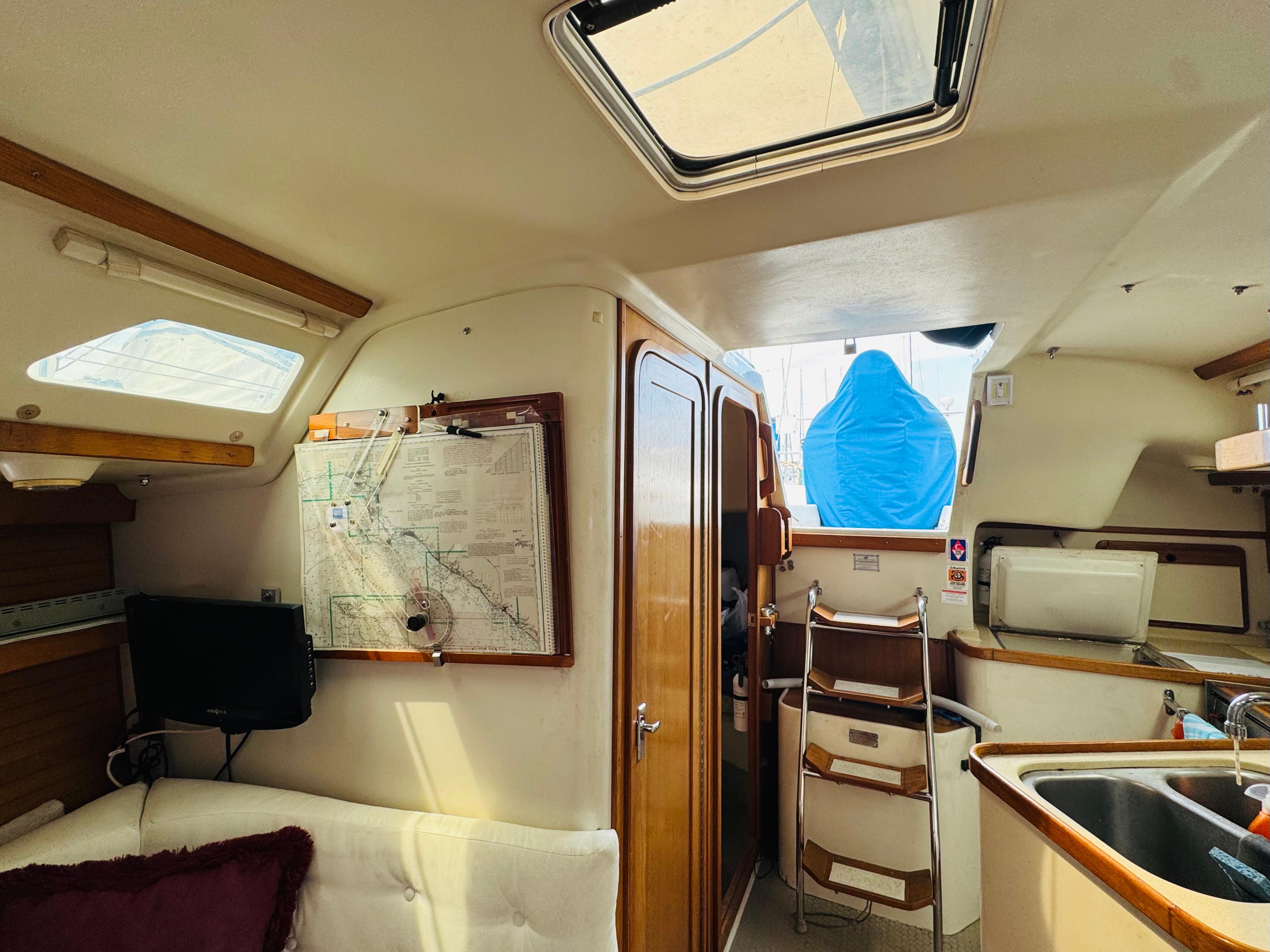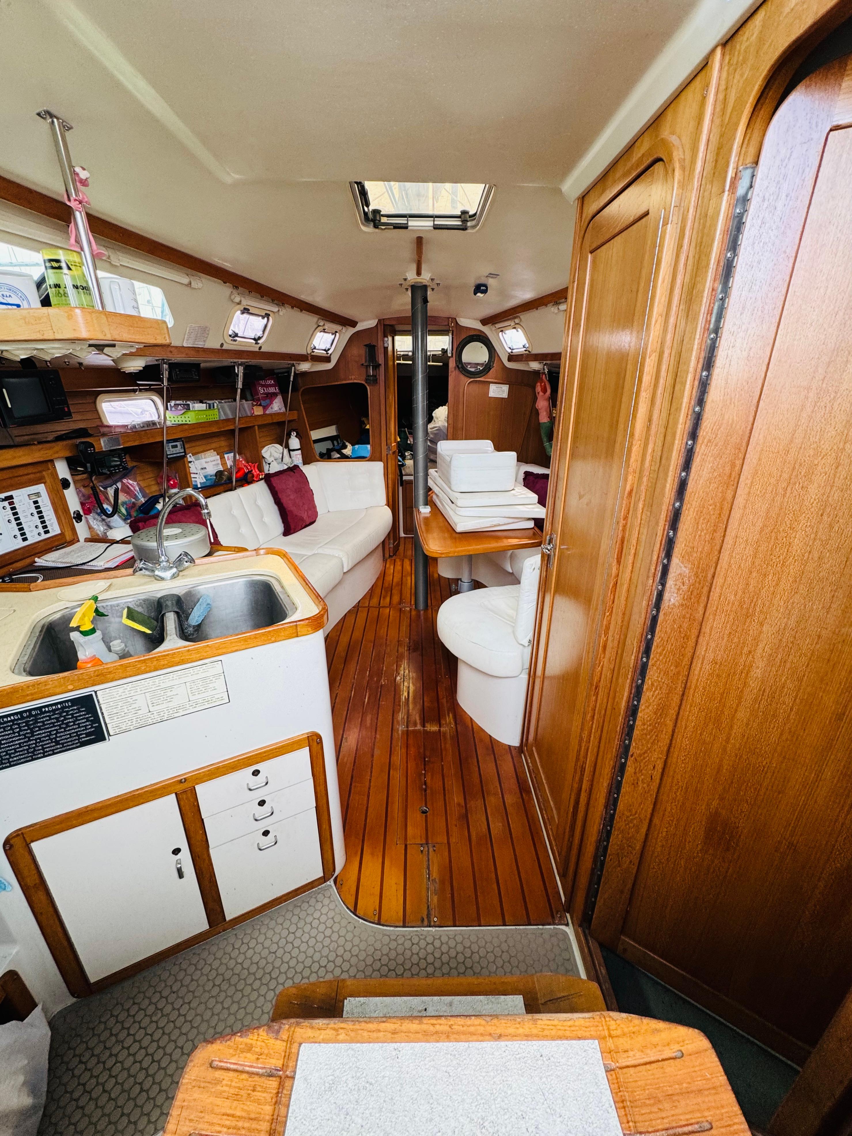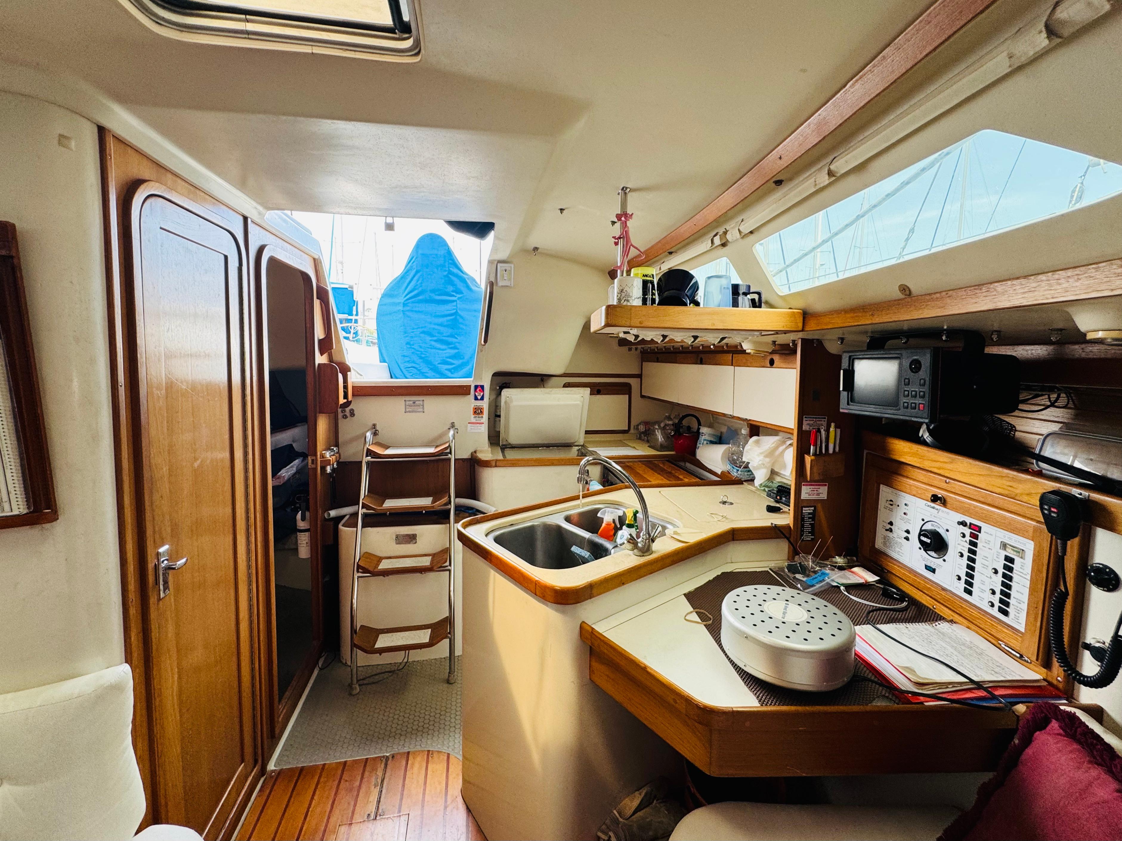 Catalina 320 featuring easy access from the large cockpit into the cabin through a wide companionway. At the bottom of the companionway to starboard is the large owner's stateroom aft with athwartships double berth, seat and hanging locker and privacy door. This cabin has excellent ventilation and light from the numerous ports. To port is a large galley for a 32 foot boat featuring stove/oven, microwave, large refrigerator, double sink, plenty of counter space with dish storage above the galley sinks.