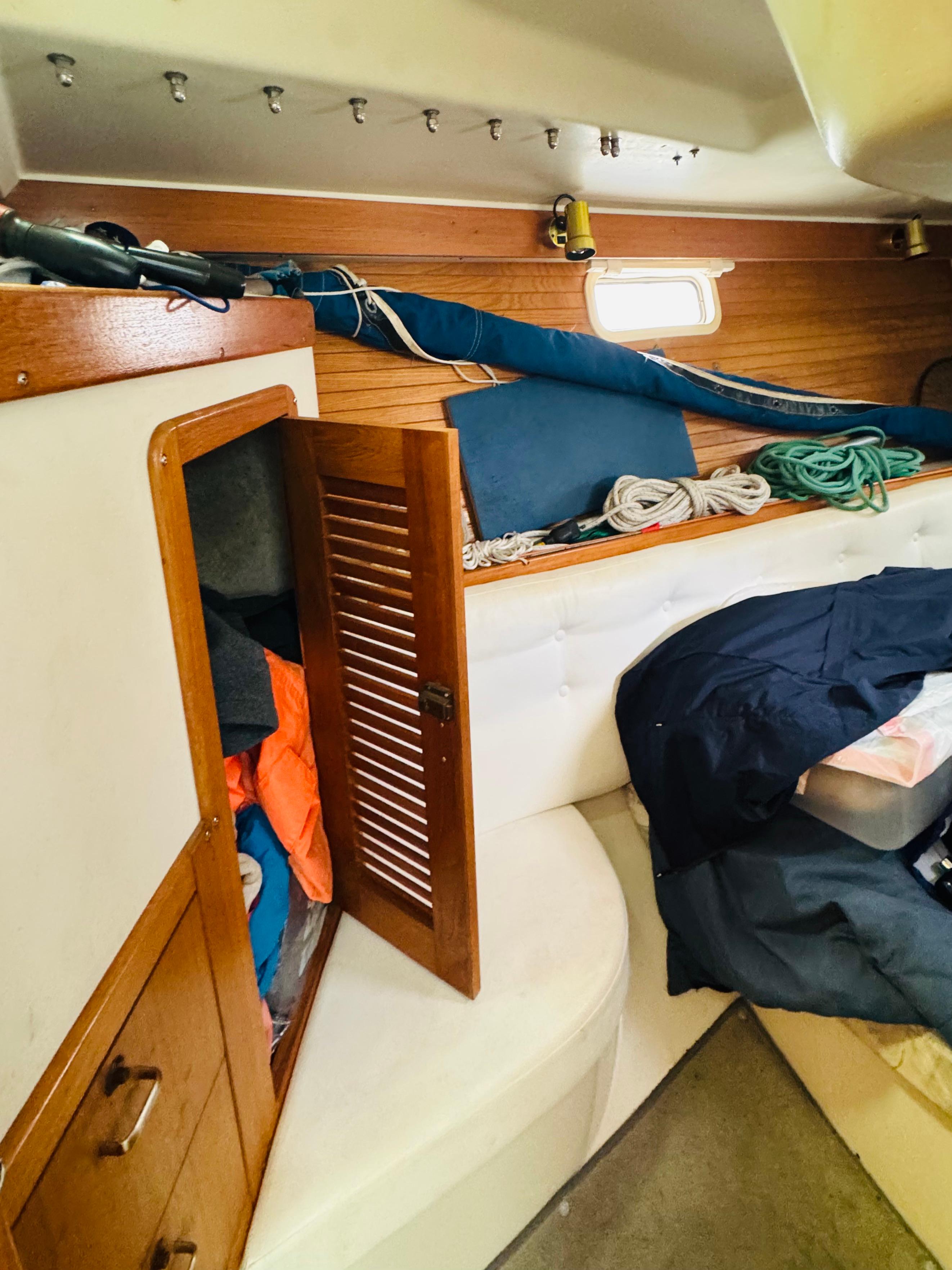 Forward of the aft stateroom on starboard is the spacious head with full standing headroom and shower. The main salon is bright and airy featuring the dining area to starboard with a settee to port with a navigation station. The guest stateroom forward of the main bulkhead features cut-outs for ventilation with a privacy door and spacious double v-berth. The cut-outs in the bulkhead can be closed for privacy.