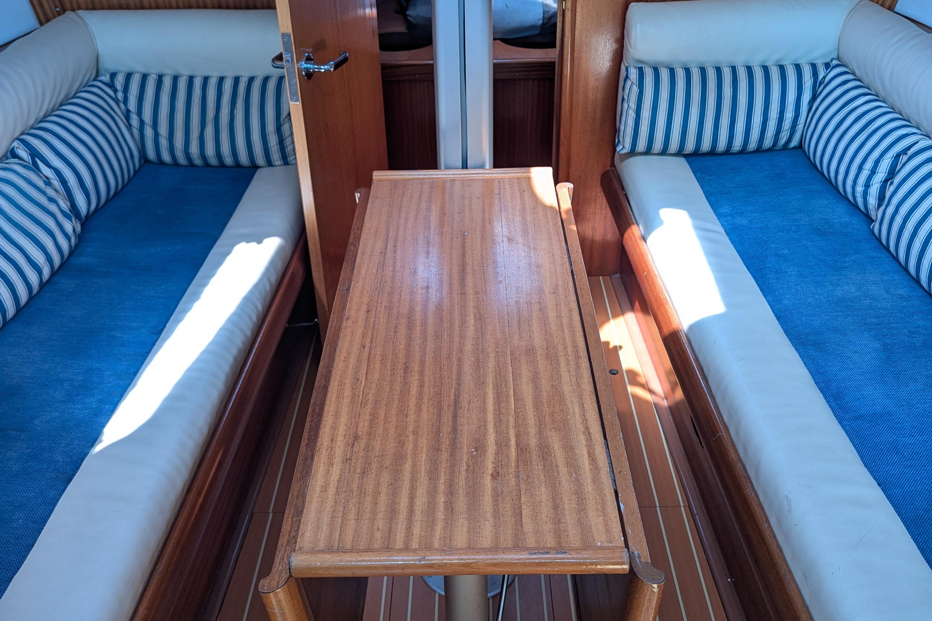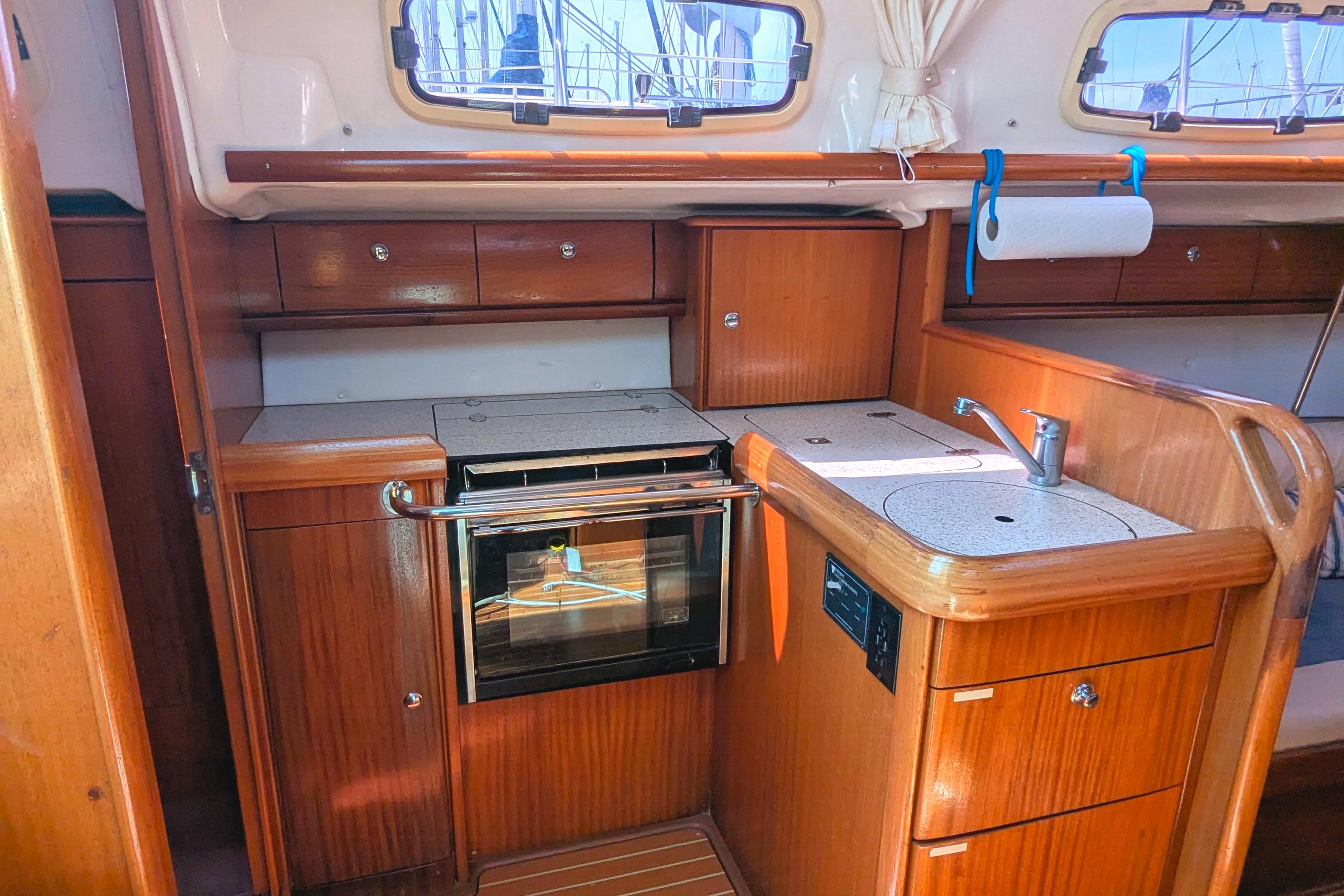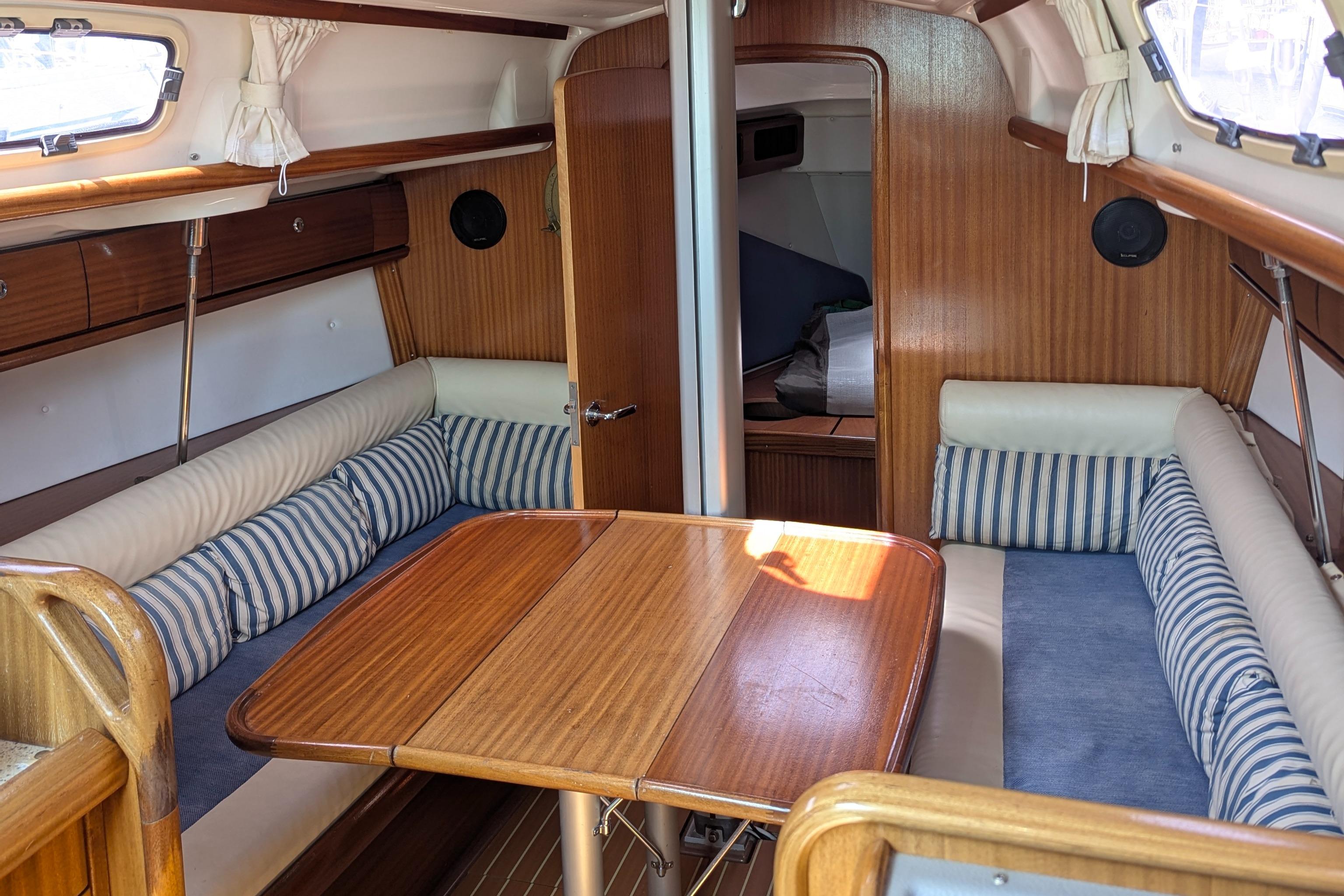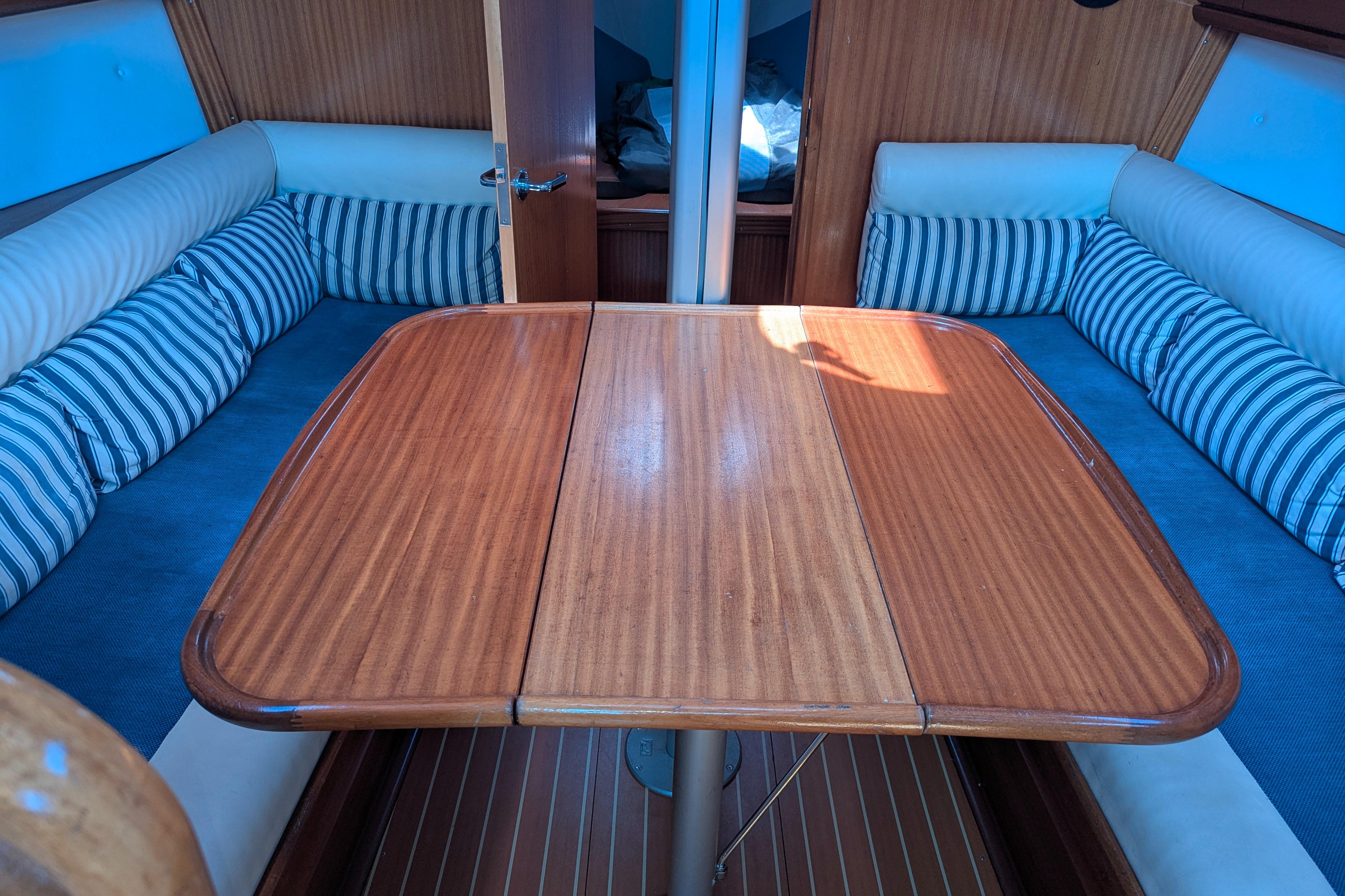 The main cabin is filled with premium Mahogany hardwoods, fine joinery and finishes. The cabin offers a practical and comfortable layout designed for life afloat. As you descend, the L-shaped galley is immediately to port, thoughtfully equipped with a stove, oven, and refrigerator – everything you need for preparing meals. Opposite to starboard is a forward-facing navigation station with a large chart table and space for electronics, simplifying passage planning. The heart of the cabin is the central saloon, featuring a spacious straight settee to port and starboard, both of which comfortably surround a large, fold-down dining table. This configuration creates an ideal space for dining, socializing, or simply relaxing, while the clever use of space ensures a bright and airy feel throughout.
