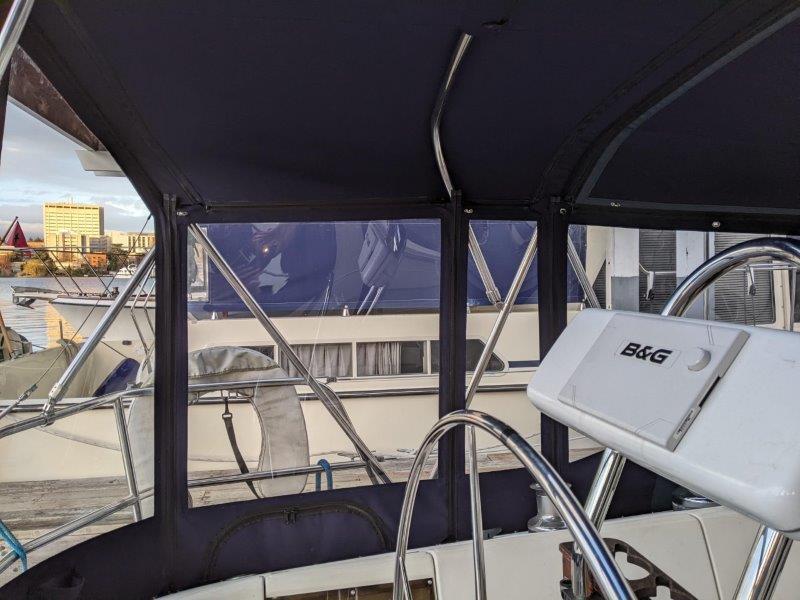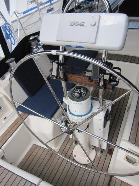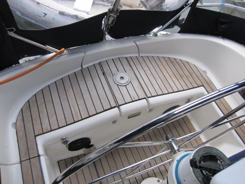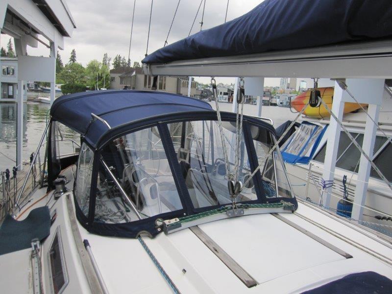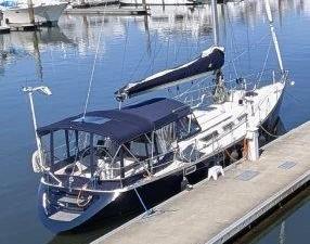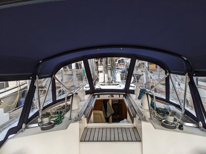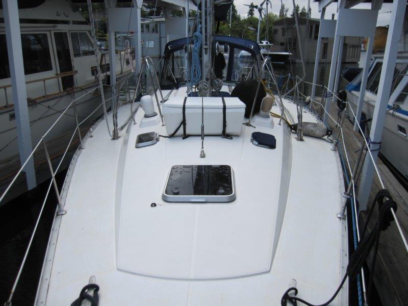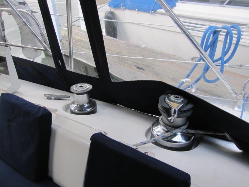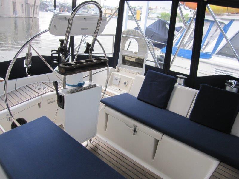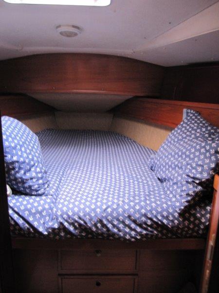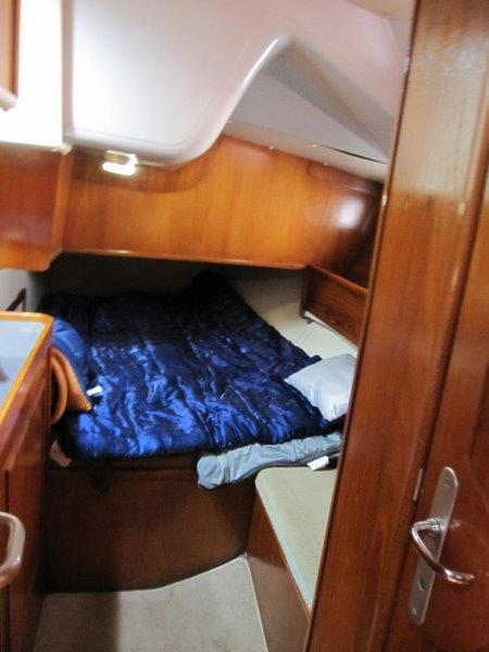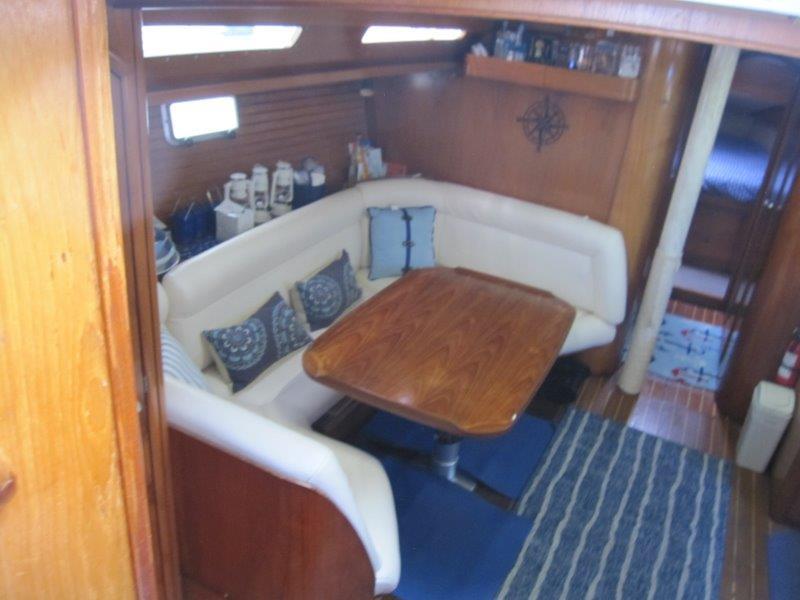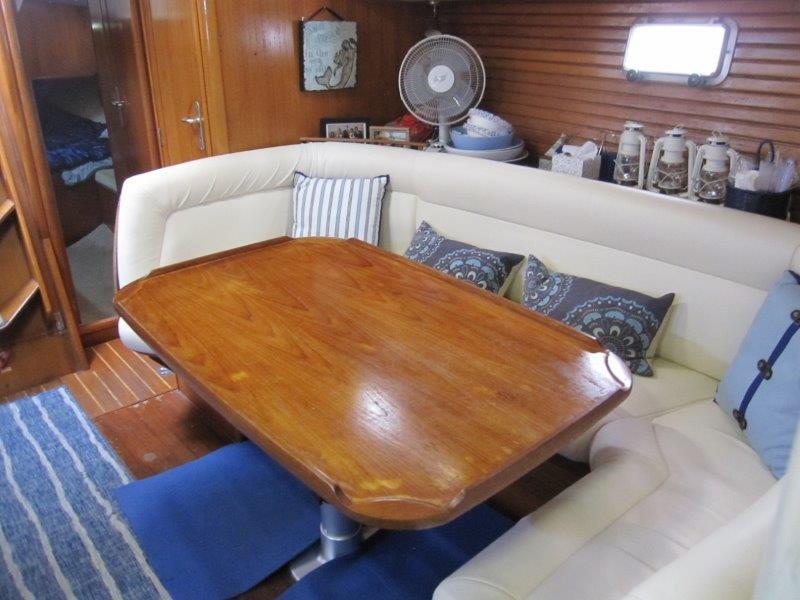 Salud is a rare 4 cabin 2 head with master cabin forward, side bunk cabin/ storage locker forward to starboard and 2 nice guest cabins aft. Aft starboard cabin has a unique vanity sink. Two nice sized heads fore and aft. Lots of seating at the big U-shaped settee - great for families & friends!