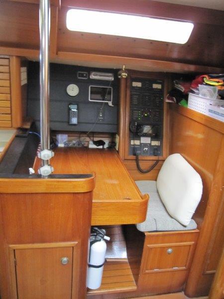 Linear U-galley to starboard amidship and large nav station aft of galley.