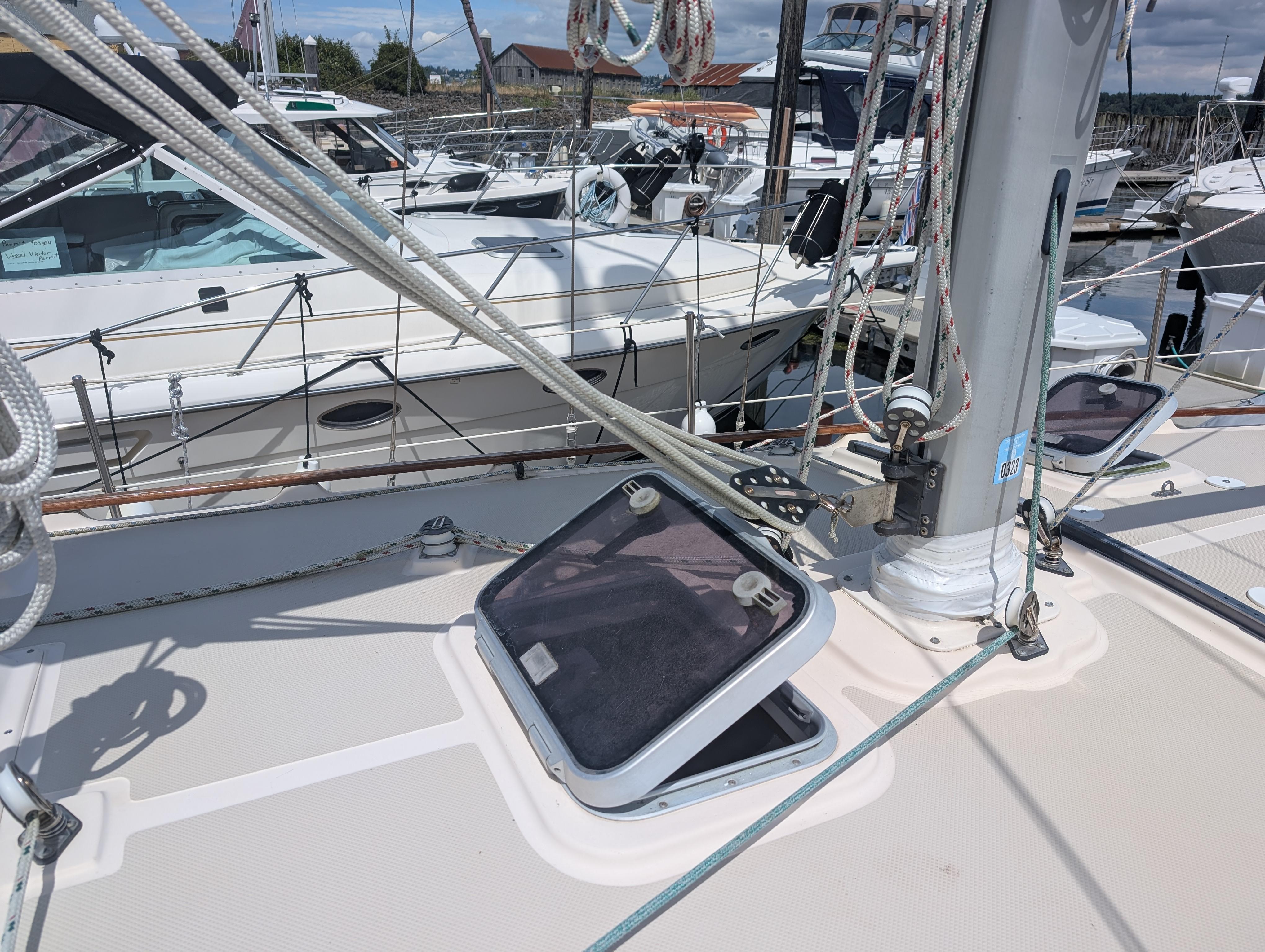 The forward stateroom offers a large, comfortable V-berth with storage drawers below. The forward cabin provides plenty of ventilation in the form of a large overhead hatch and two opening ports.