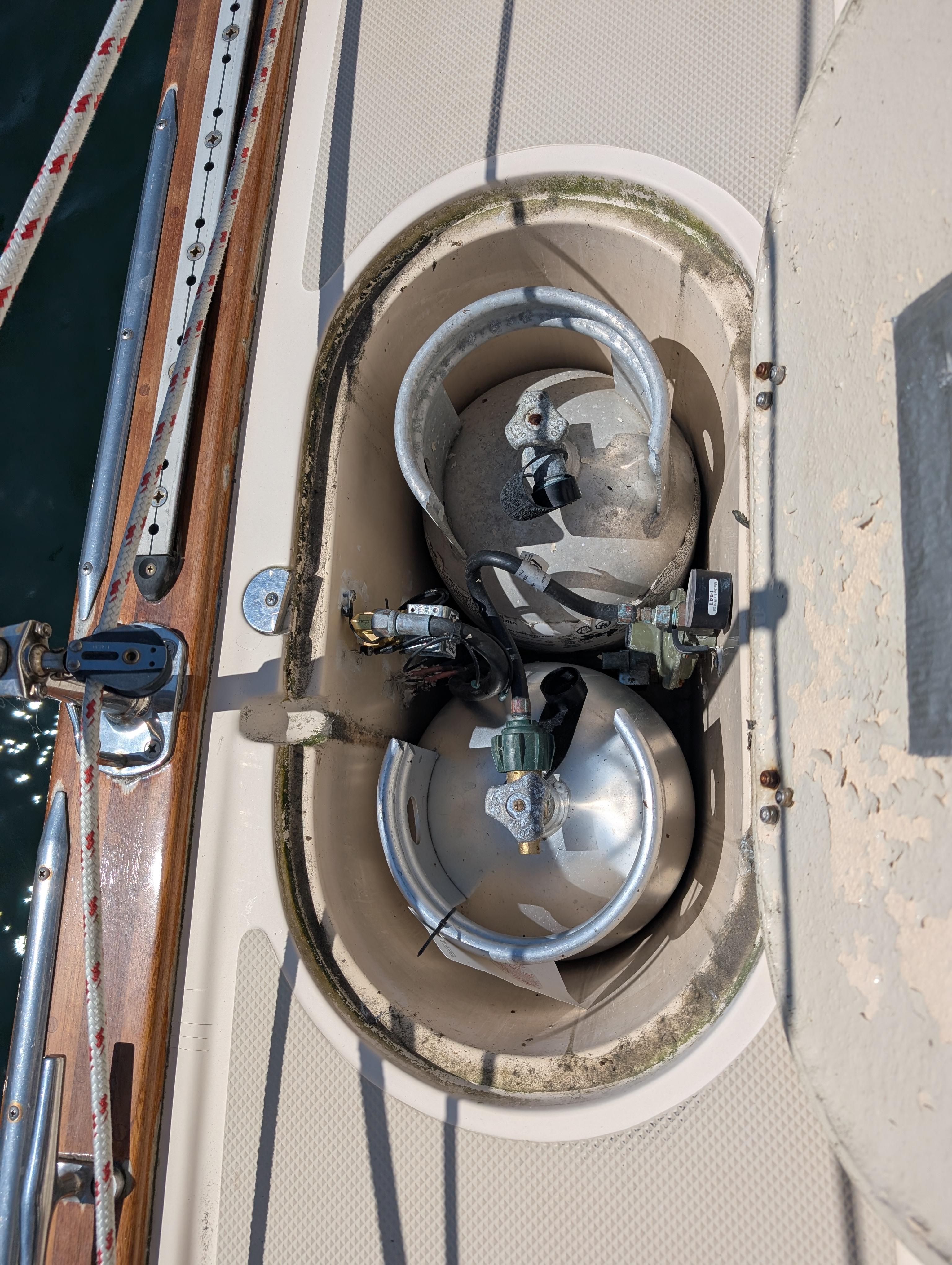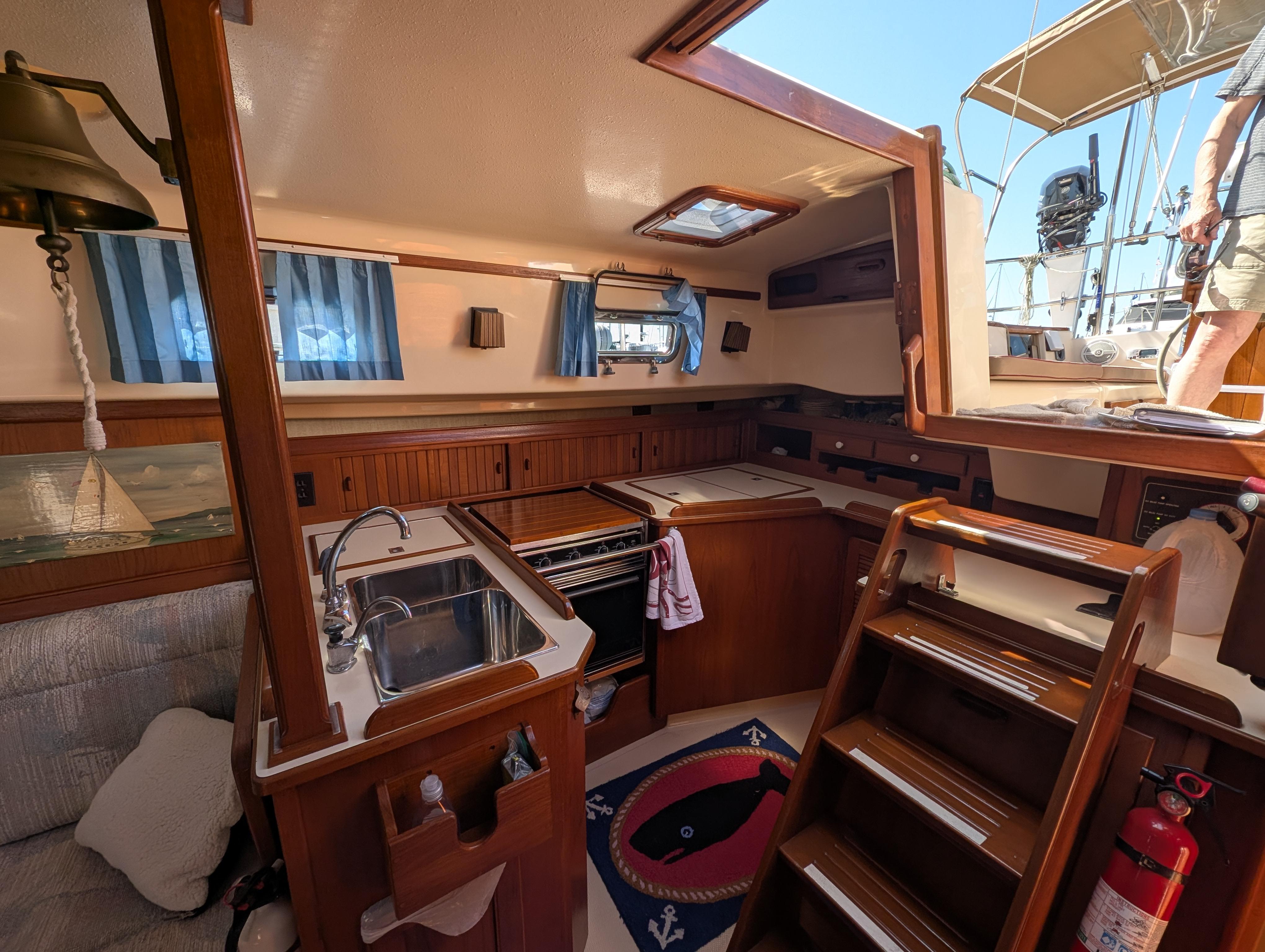 The Galley is opposite the nav station to starboard and incorporates molded non-skid to increase safety and durability in this high-traffic area. The well-insulated icebox has interior shelves, a direct-overboard electric drain pump, and ample volume for holding ice and provisions. Numerous drawers, Formica-lined cabinets and lockers, and built-in dish and cutlery storage provide ample room for stores and utensils. In addition, the galley features a fold-up counter extension, deep polished stainless steel sinks, a safety-type LPG range with oven complete with guardrail and harness attachments.