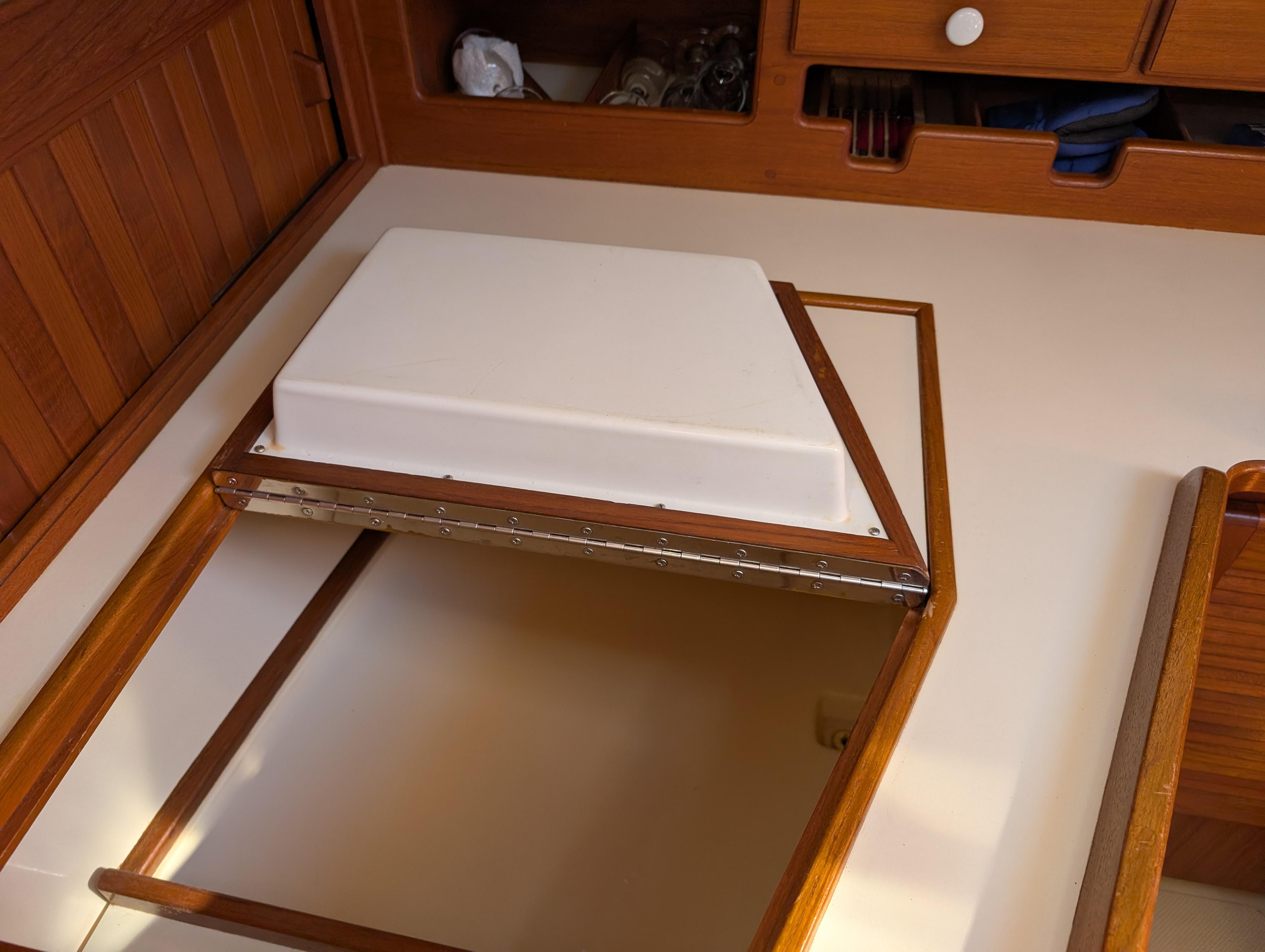 The NAV table shares the aft end of the port settee for the navigator’s seat and has ample room for bound chart kits or folded admiralty charts. The electrical control panel is housed in a built-in cabinet over the NAV table, with the stereo, and VHF Radio located in a panel to the right.