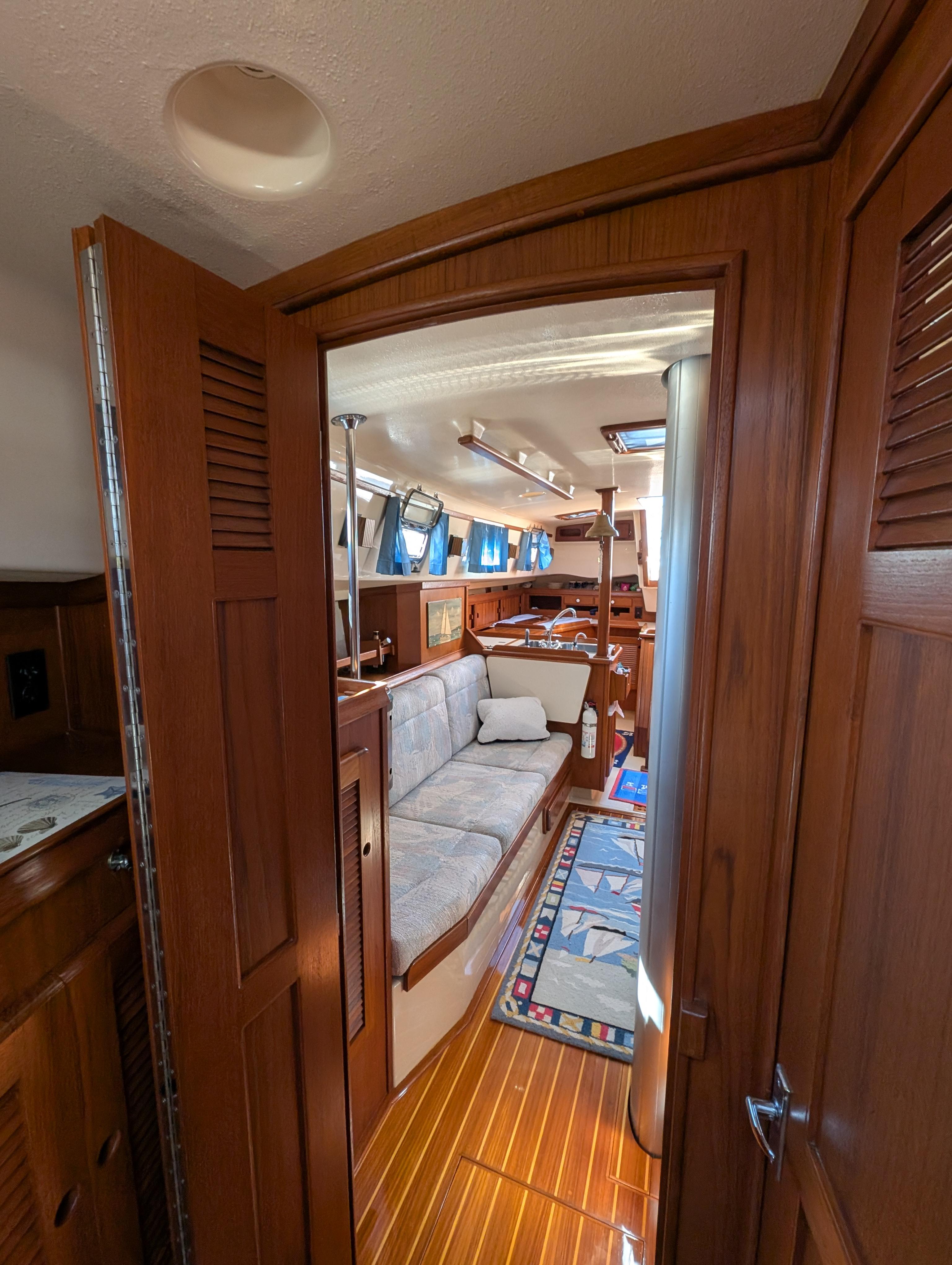 The head is located just aft of the forward stateroom to port. It offers a large wrap-around counter, lots of cabinets, a shower with a contoured seat and curtain, and drains that work heeled in either direction. In addition, there is private access from either the salon or the forward cabin.