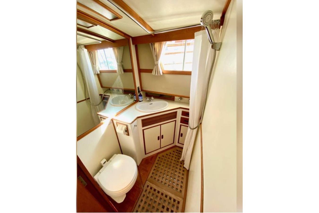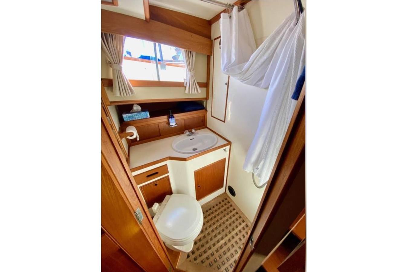 Stepping aft from the main salon, down two steps is the owner's cabin featuring a double berth to starboard with a 6' mattress and a single berth to port. The owner's head features a large mirror on the forward bulkhead that accentuates the sense of space, a single sink with hot and cold pressure water, a freshwater Vacuflush toilet, and an integral flexible wand shower with a teak grate floor.