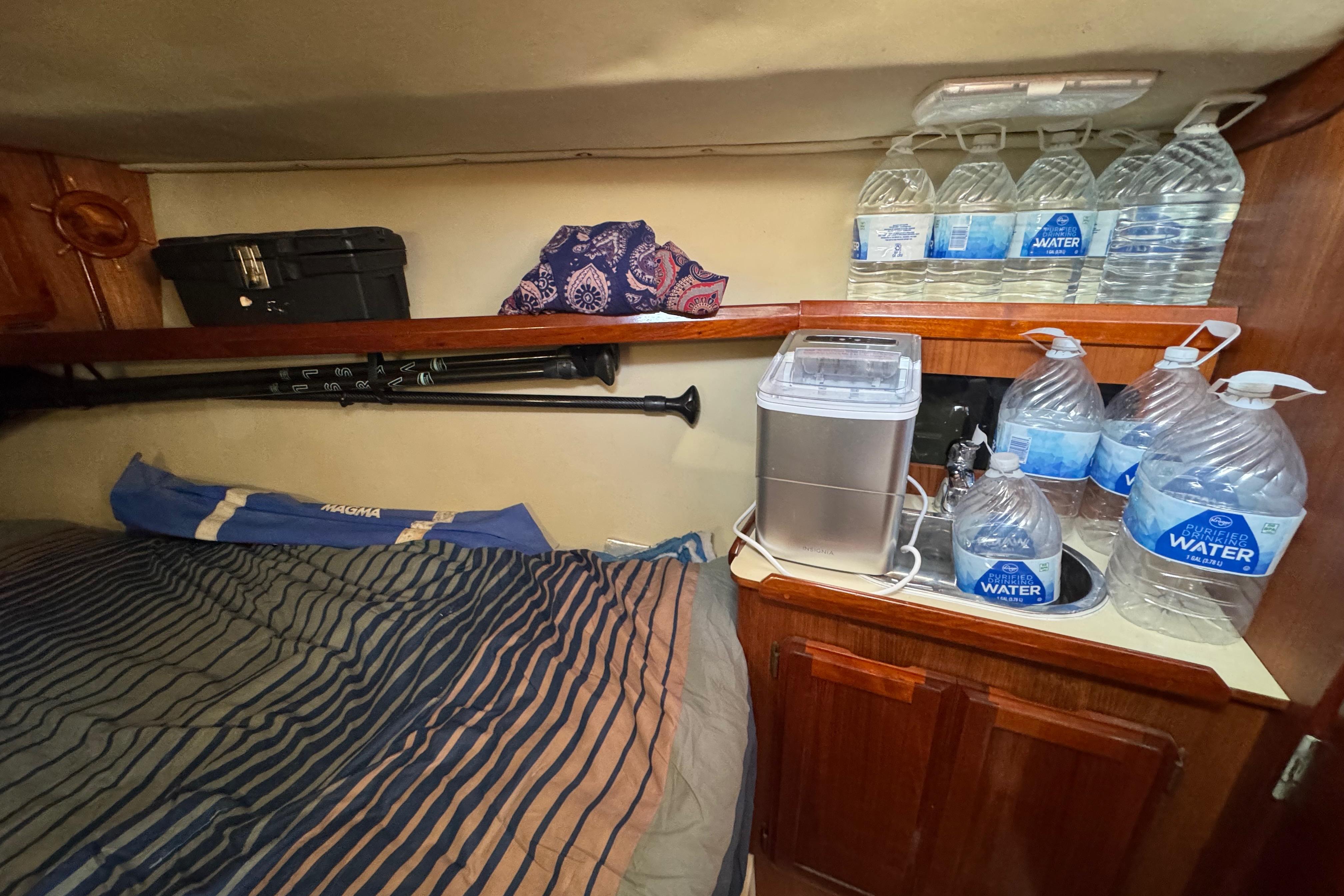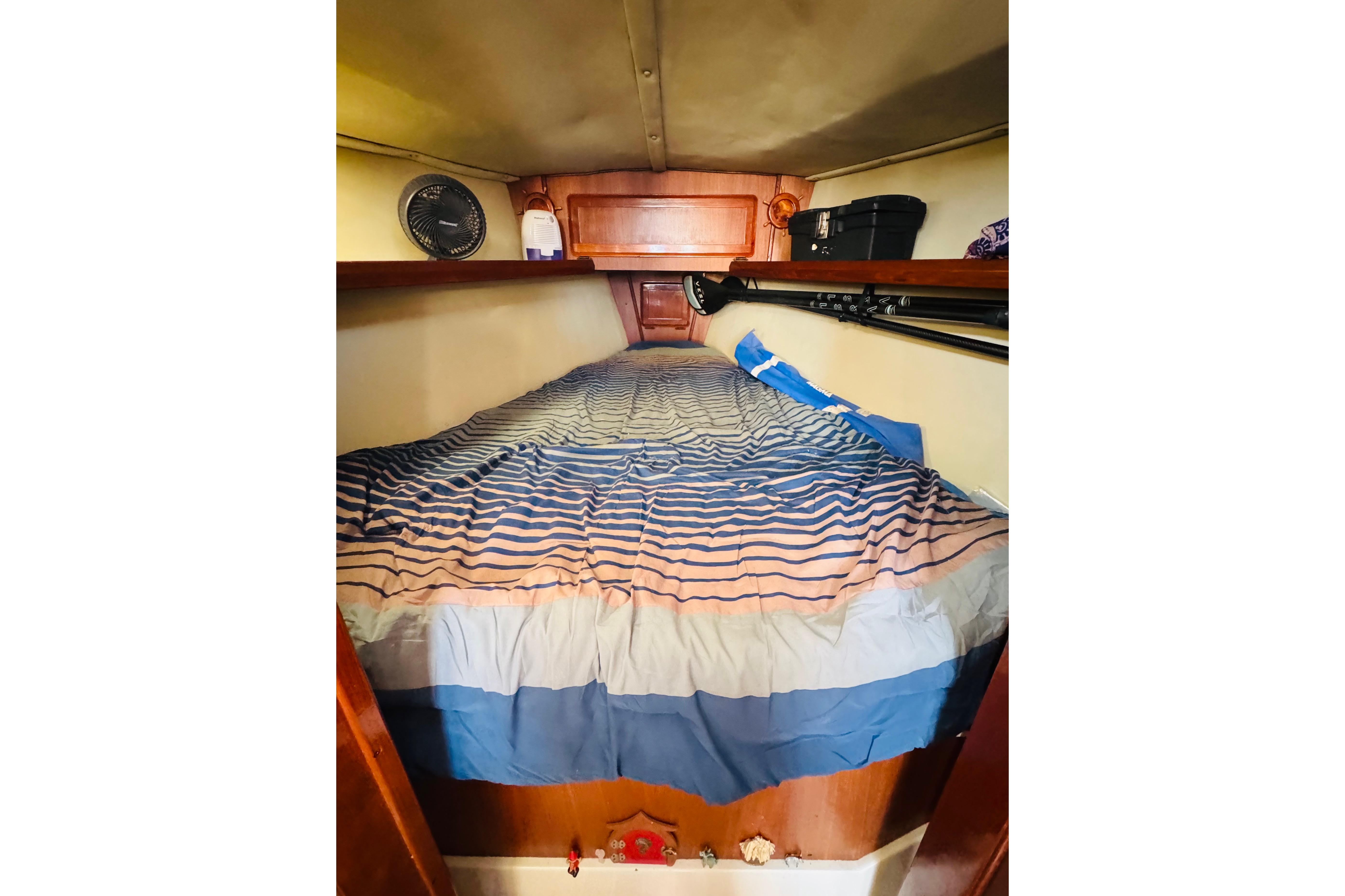 Had custom boat bed with latex mattress reconfigured and upholstered for v-berth. Full-sized, like new mattress in aft cabin